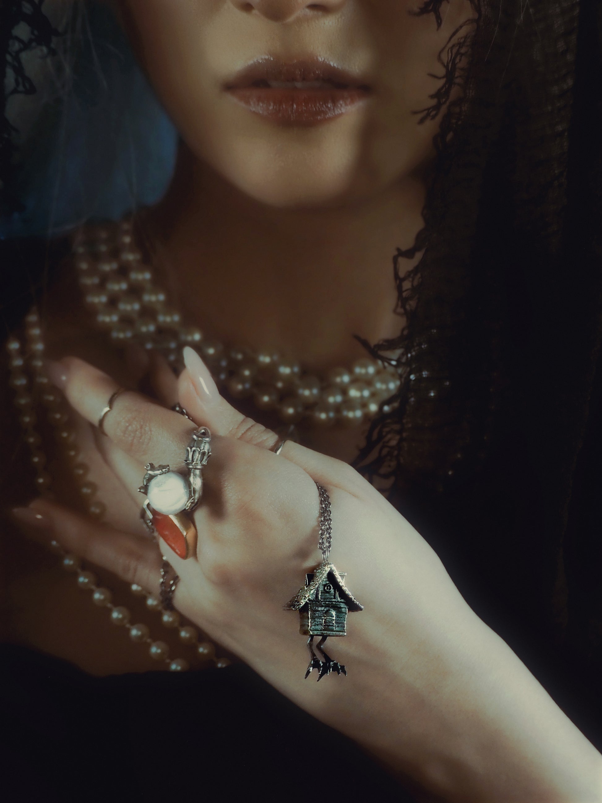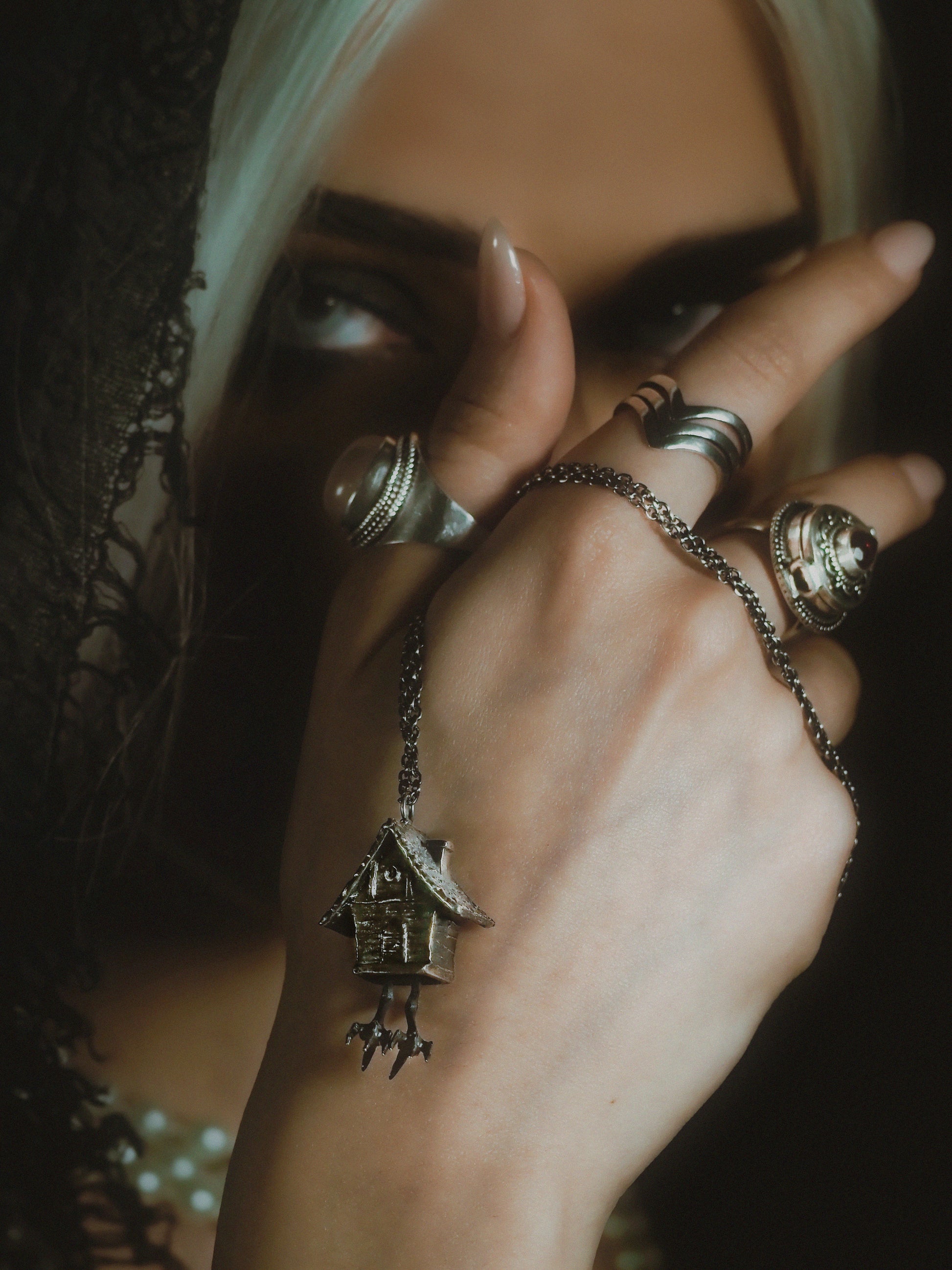 A mystical necklace inspired by Slavic folklore. Wrapped around your neck, feel the whispers of the forest and Baba Yaga's enchantment. Venture deep into tales untold with its unique, handcrafted charm depicting a hut on chicken feet. Embrace your inner witch!