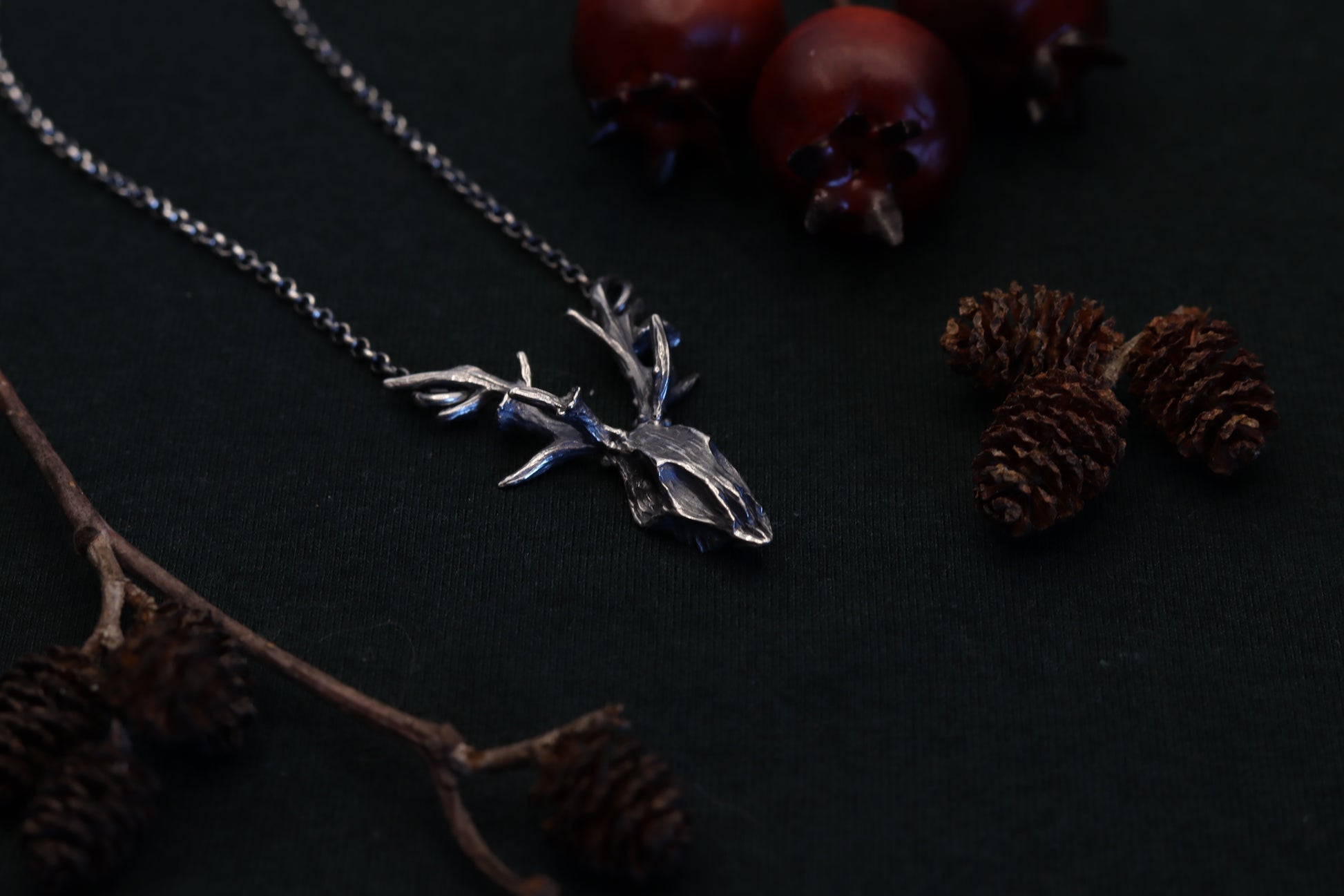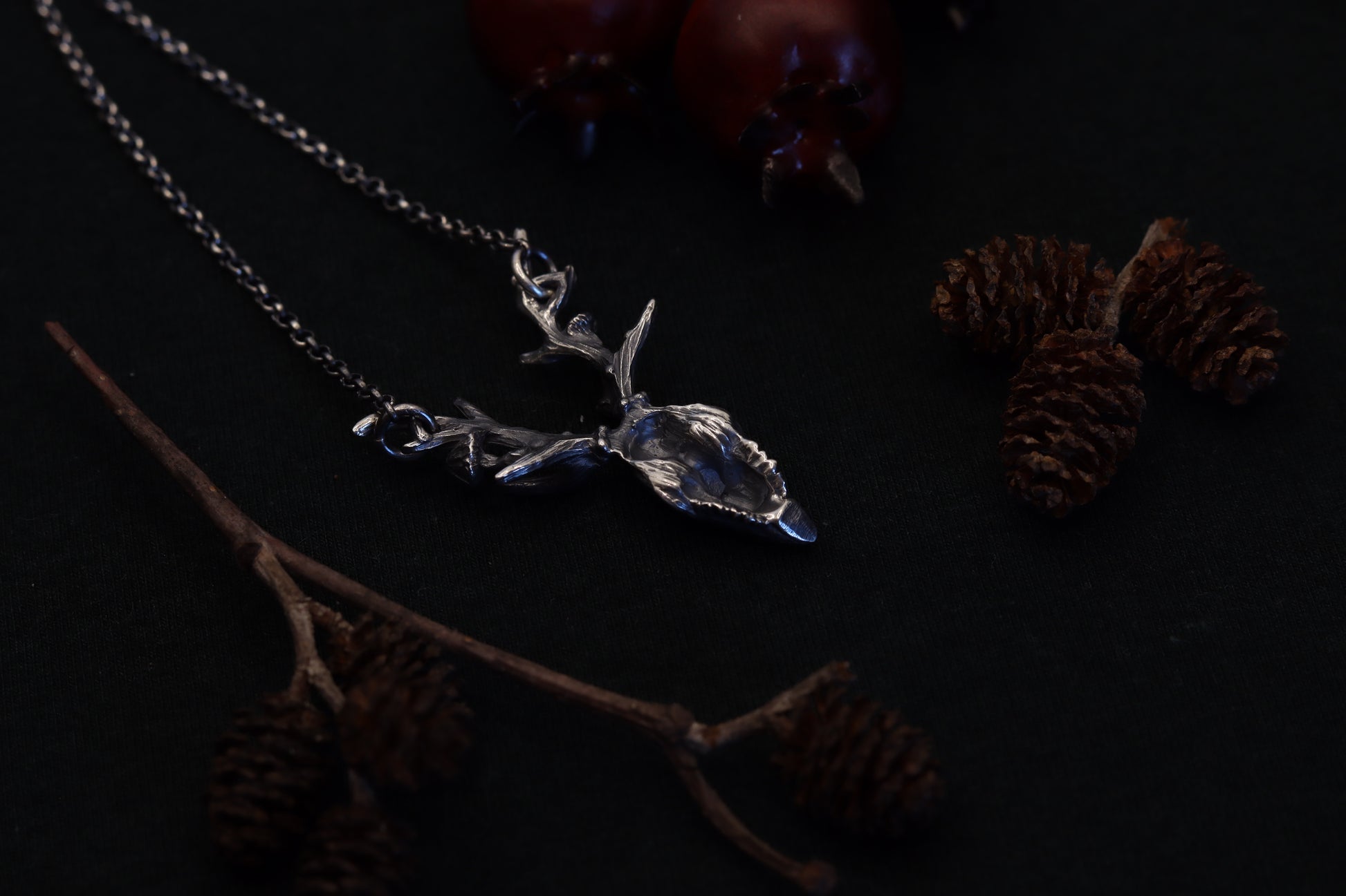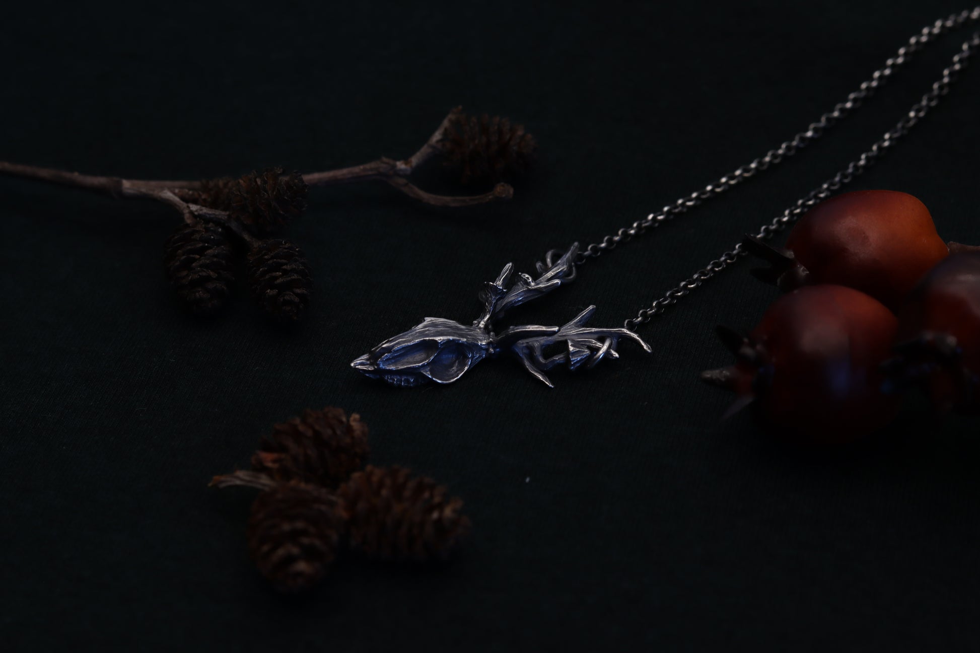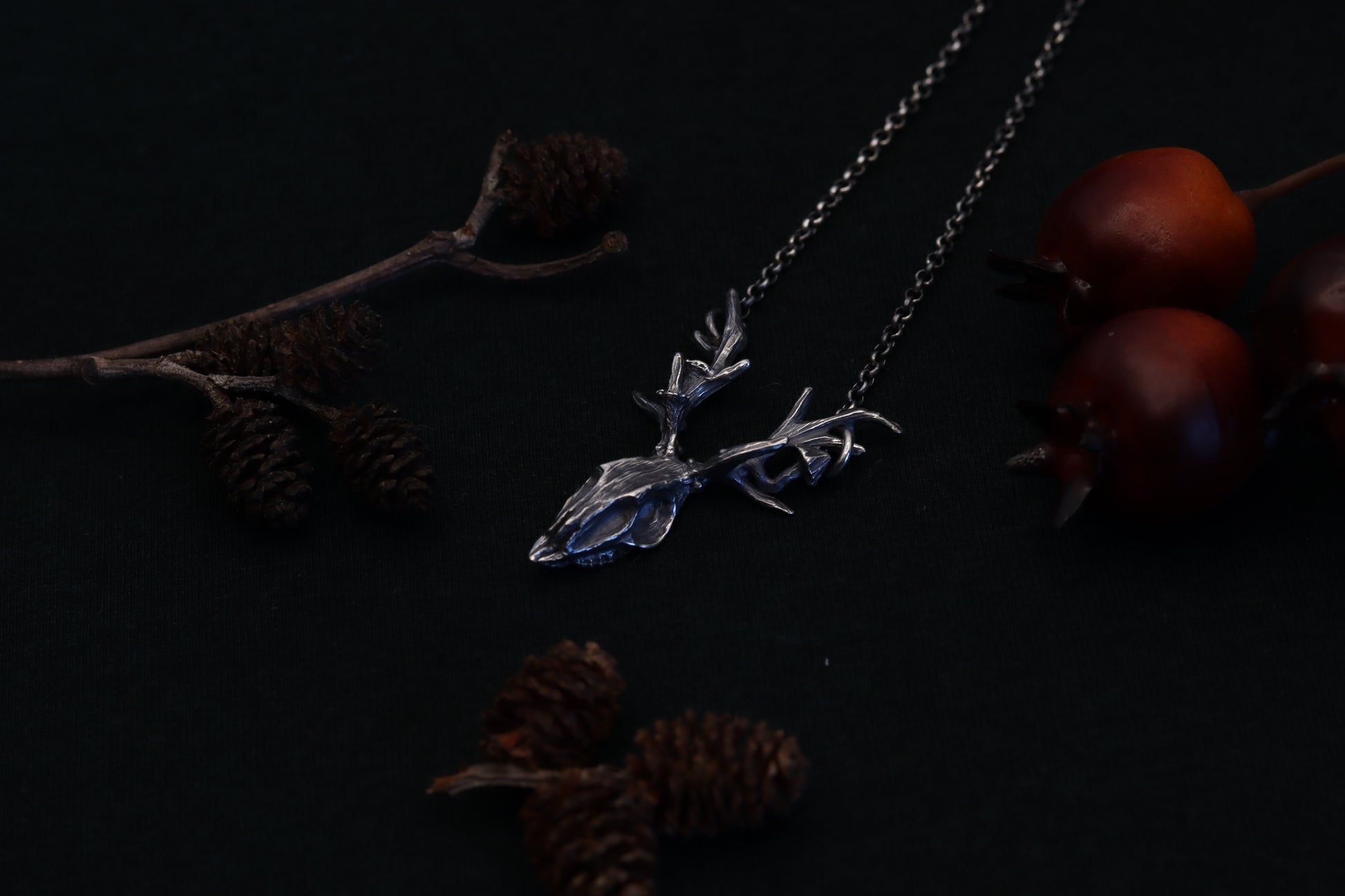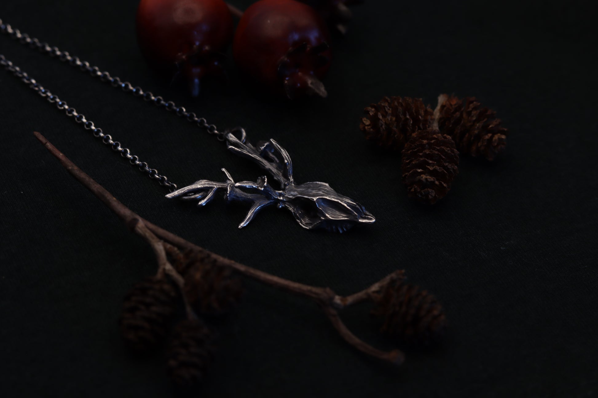 A deer skull necklace, delicately crafted for woodland wanderers. As you tread through the fallen leaves and eerie mists, embrace the enigma of the forest. An emblem for those who seek the wild and the wondrous.