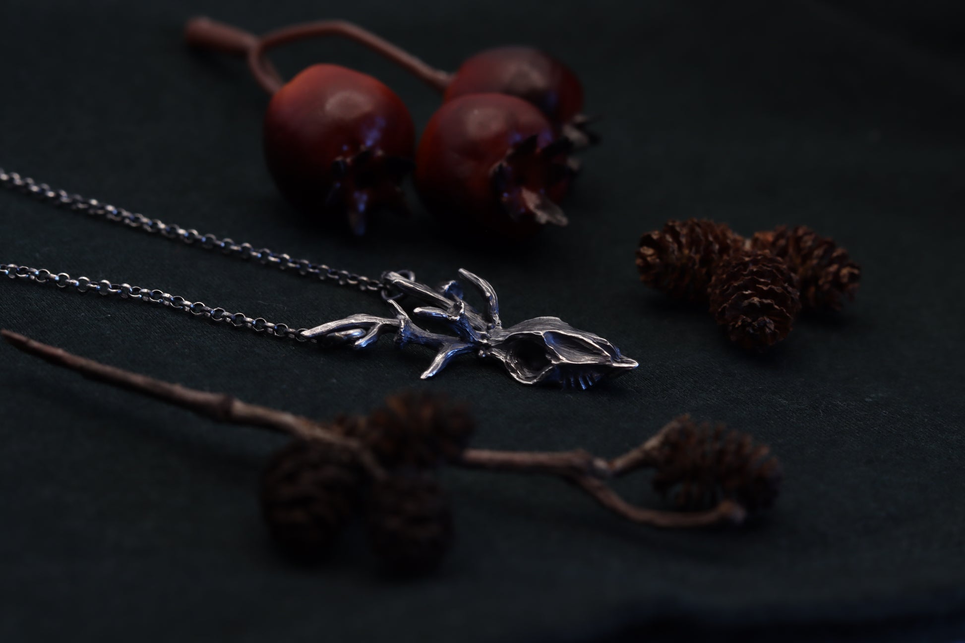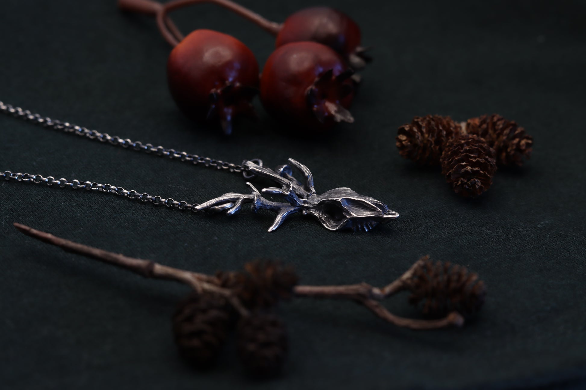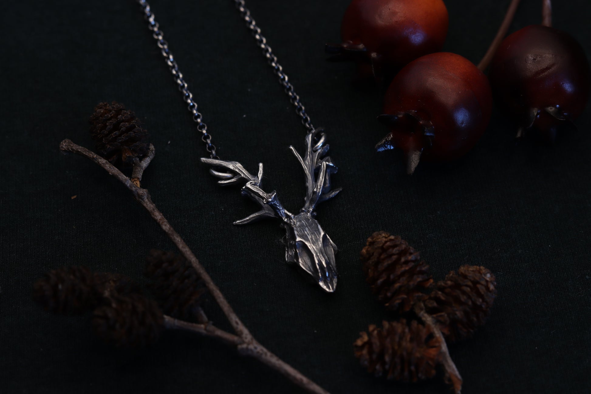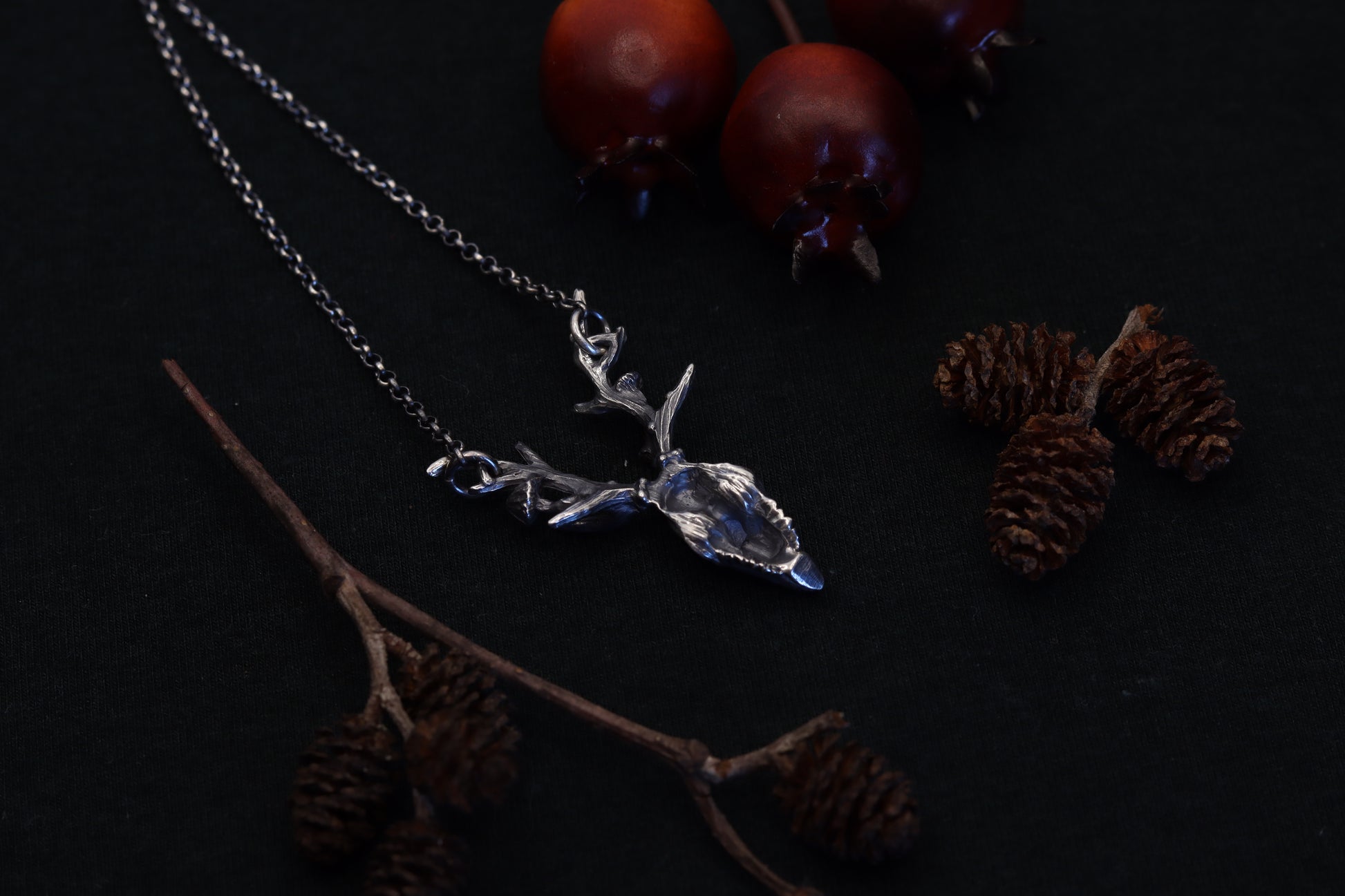 A deer skull necklace, delicately crafted for woodland wanderers. As you tread through the fallen leaves and eerie mists, embrace the enigma of the forest. An emblem for those who seek the wild and the wondrous.