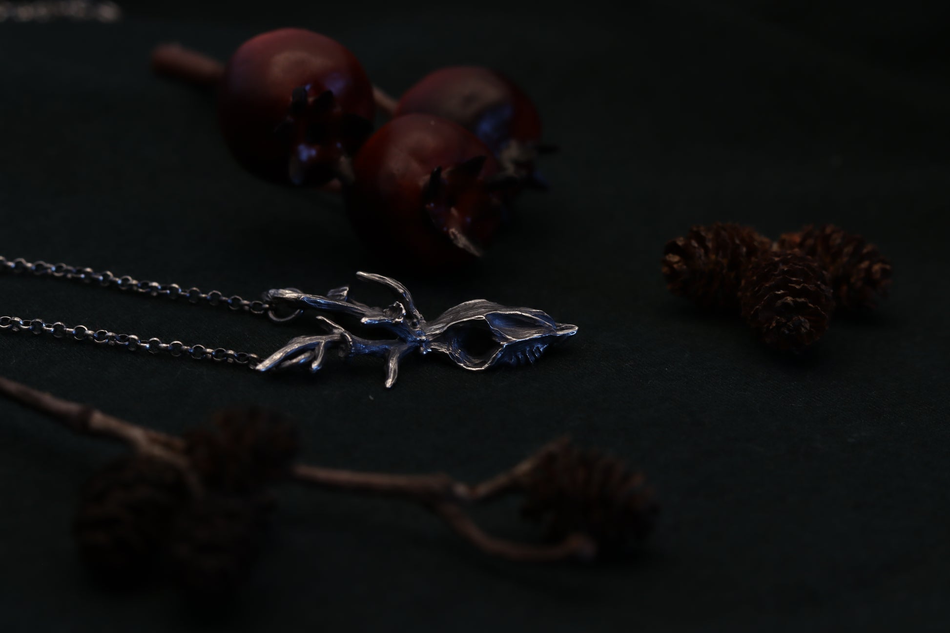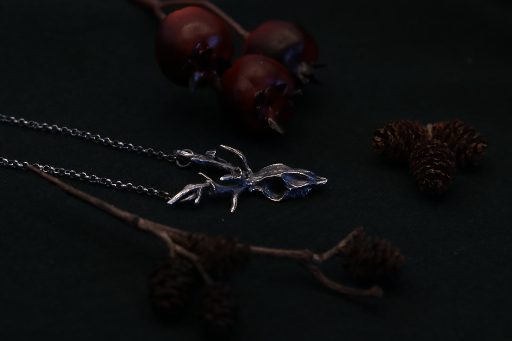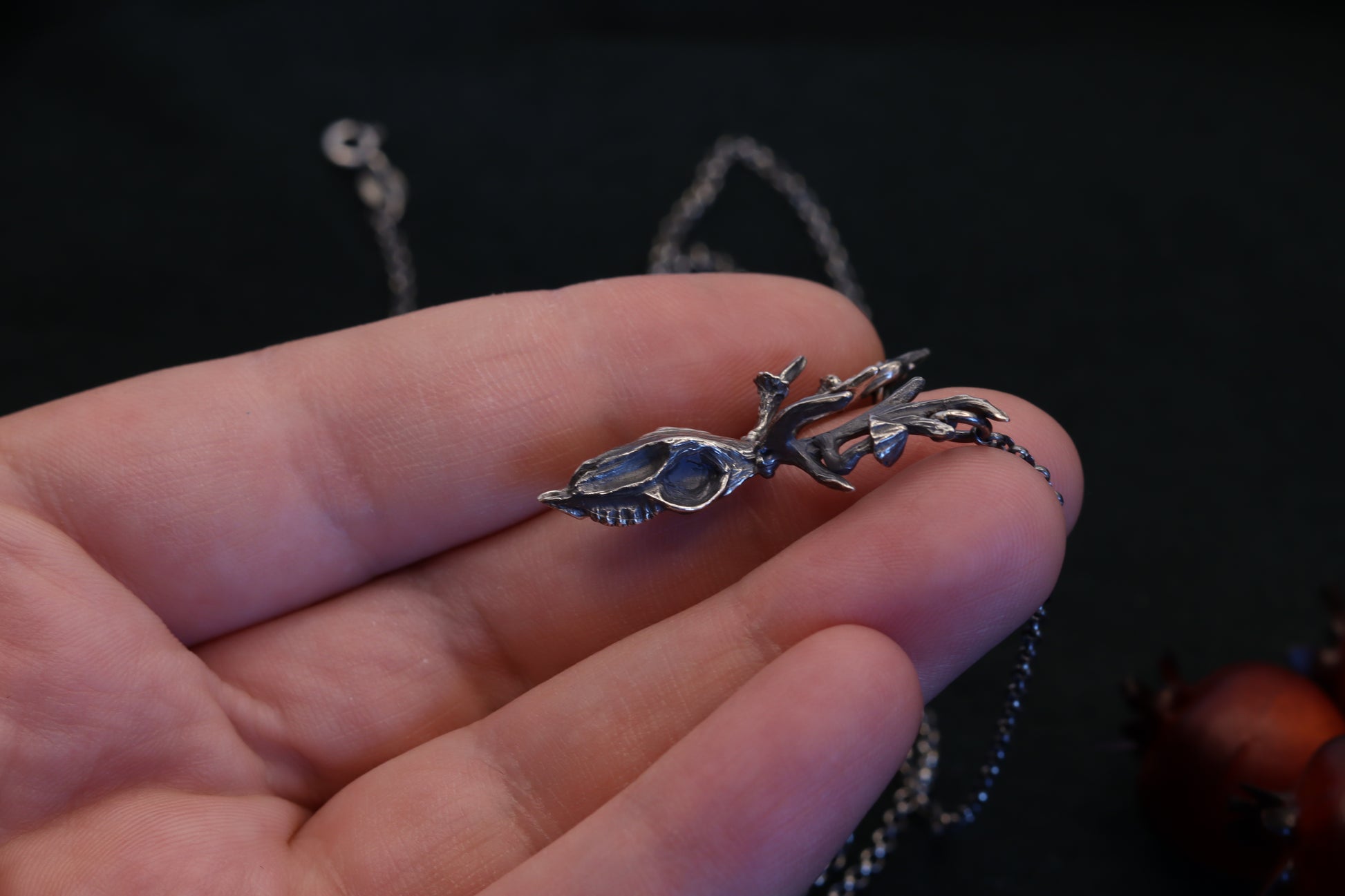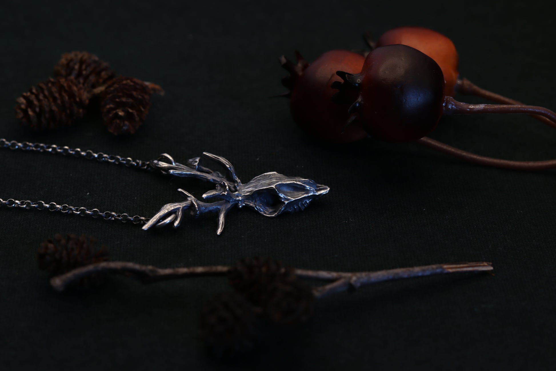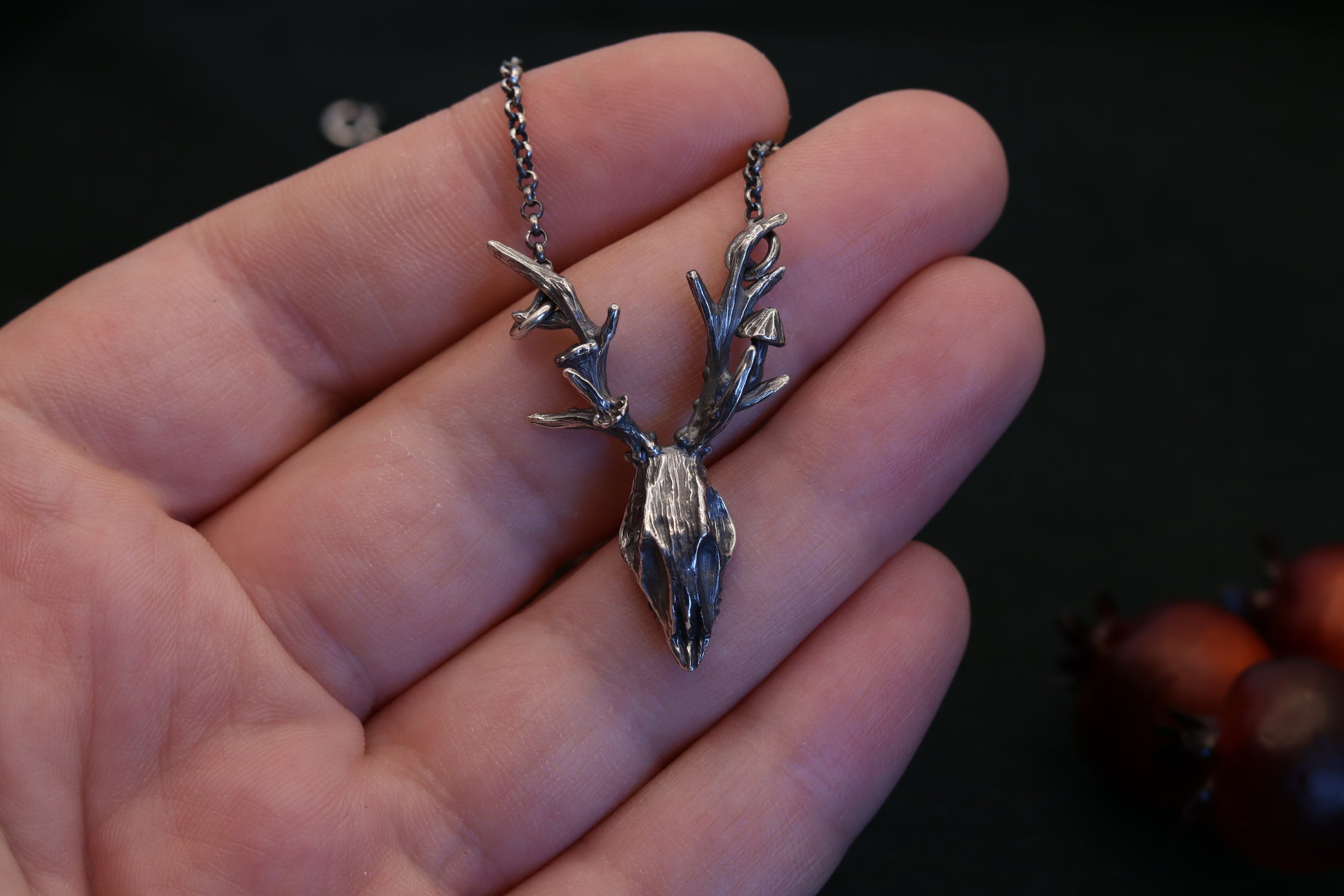 A deer skull necklace, delicately crafted for woodland wanderers. As you tread through the fallen leaves and eerie mists, embrace the enigma of the forest. An emblem for those who seek the wild and the wondrous.