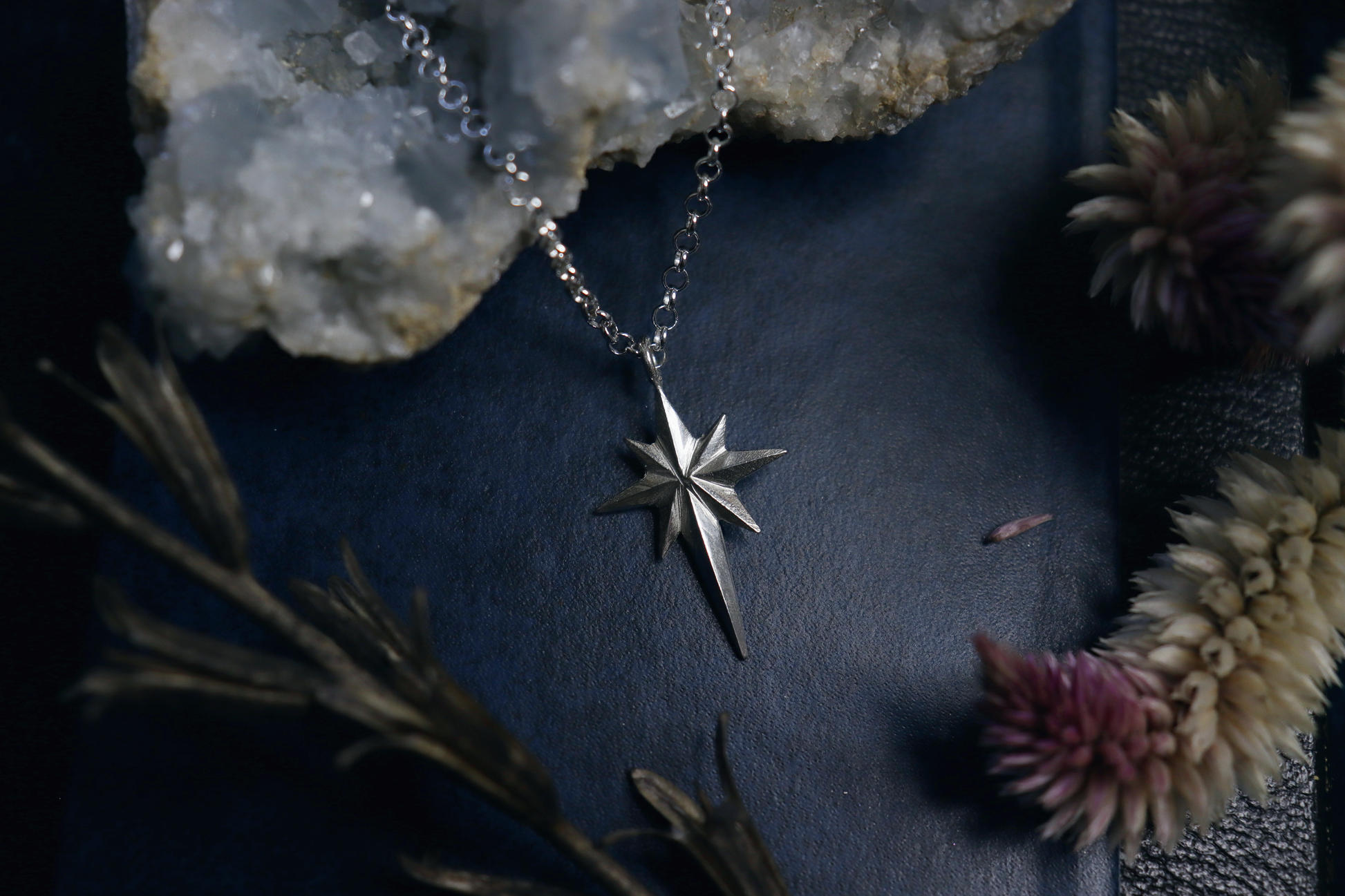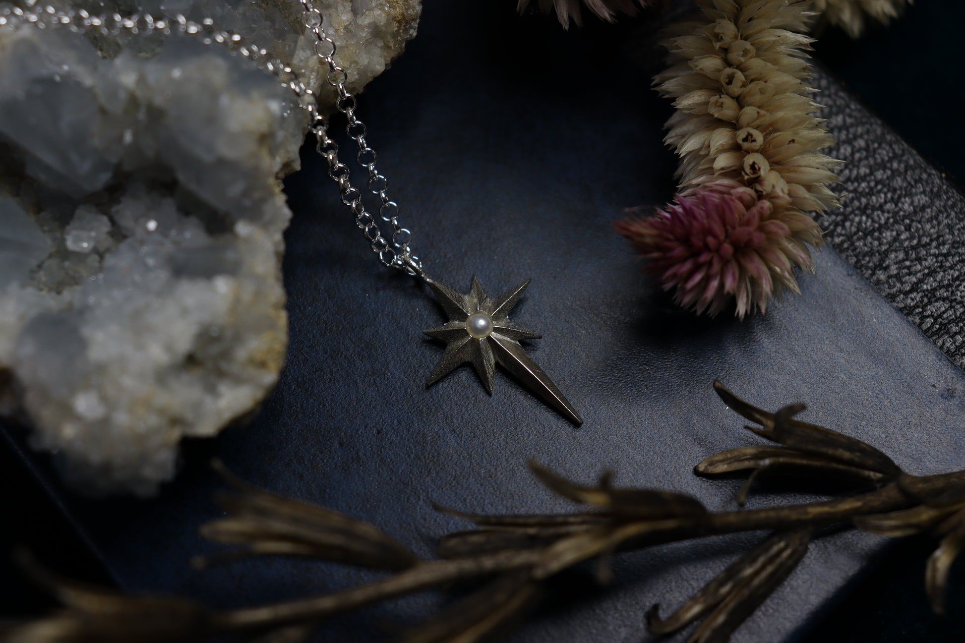 Inspired by the star embedded into Galadriel's plate armor, this finely hand-carved necklace captures the essence of courage and grace before the storm. Crafted in sterling silver with a pearl at its center, the necklace features delicate designs reminiscent of Elven craftsmanship.