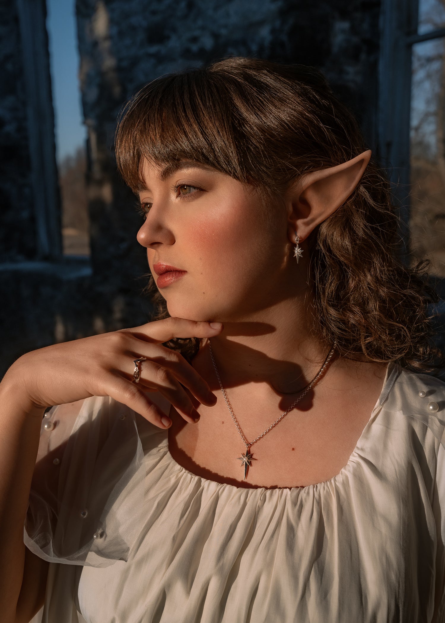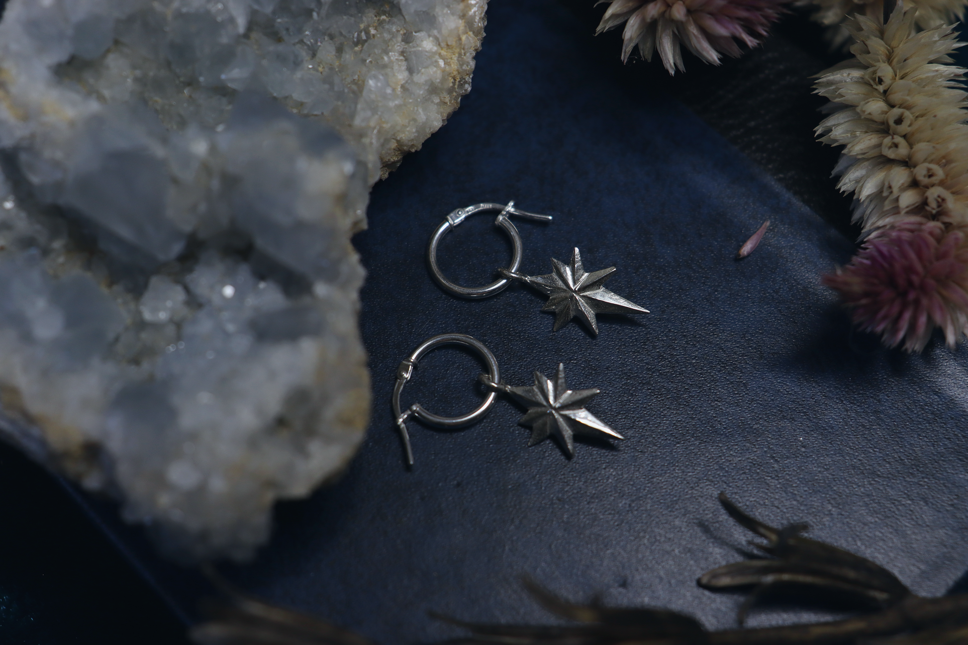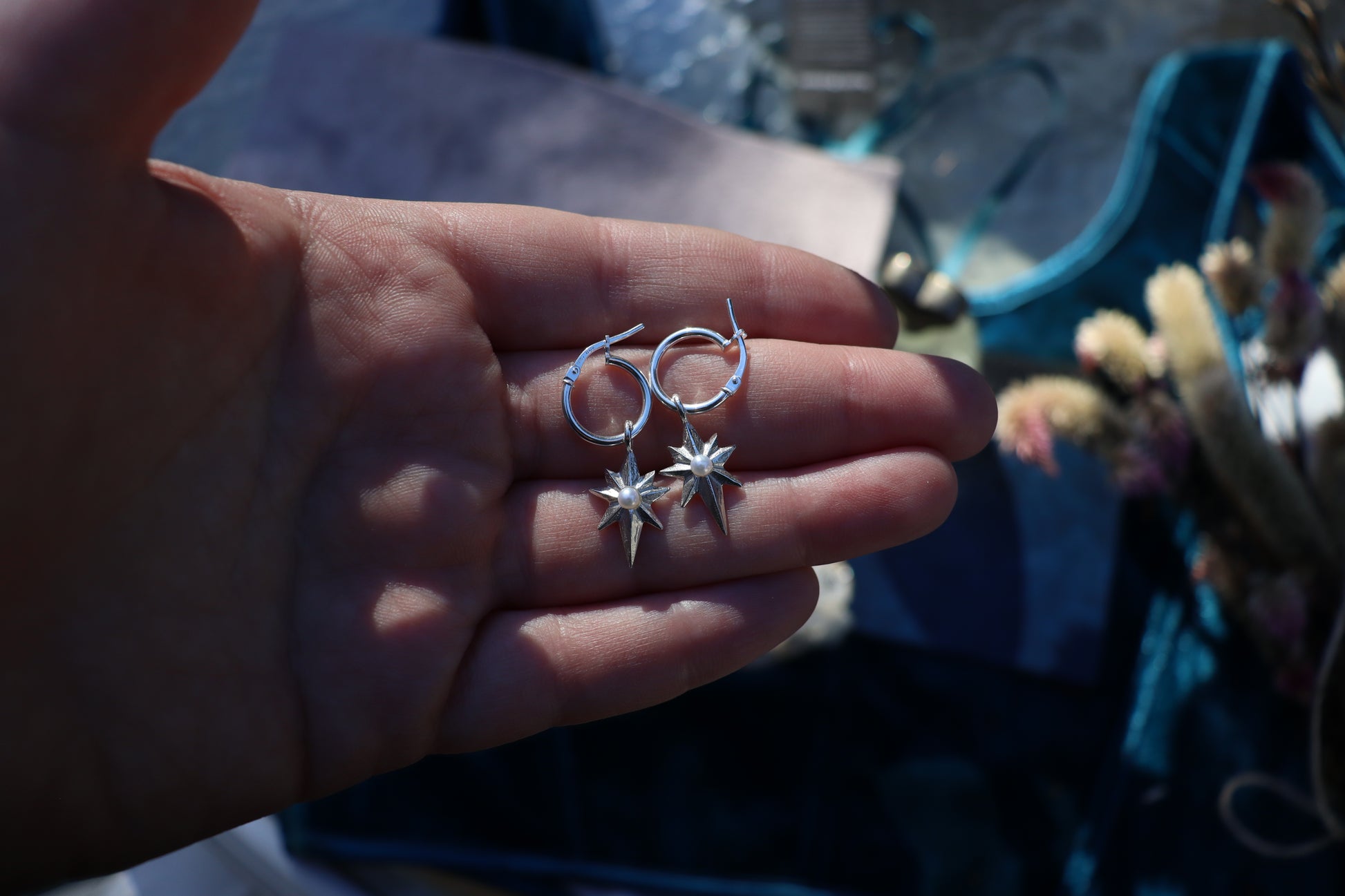 Inspired by the star embedded into Galadriel's plate armor, these finely hand-carved earrings captures the essence of wisdom and beauty of the lady of light. Crafted in sterling silver with a pearl in the center of each star, the earrings features delicate designs reminiscent of Elven craftsmanship.