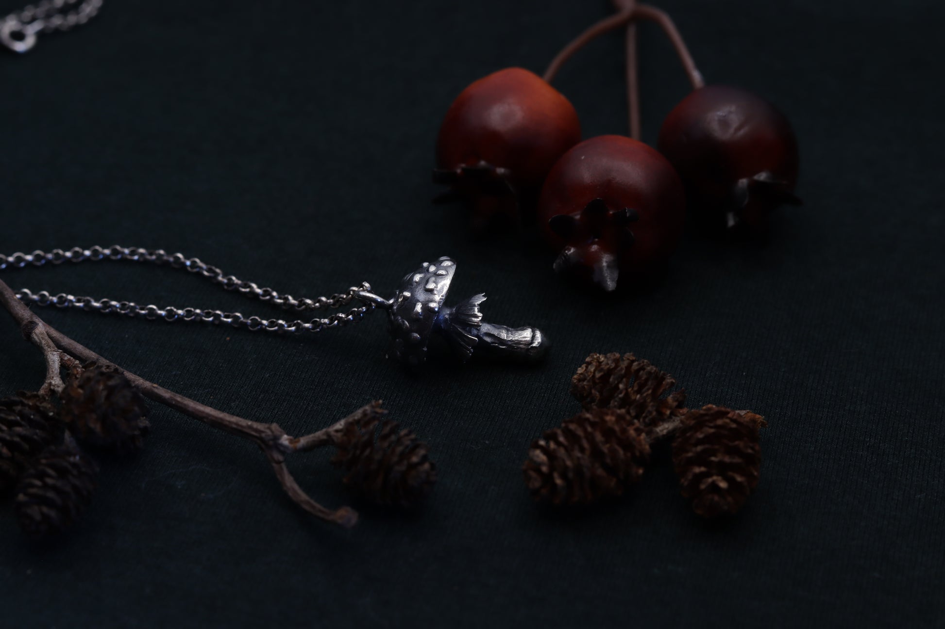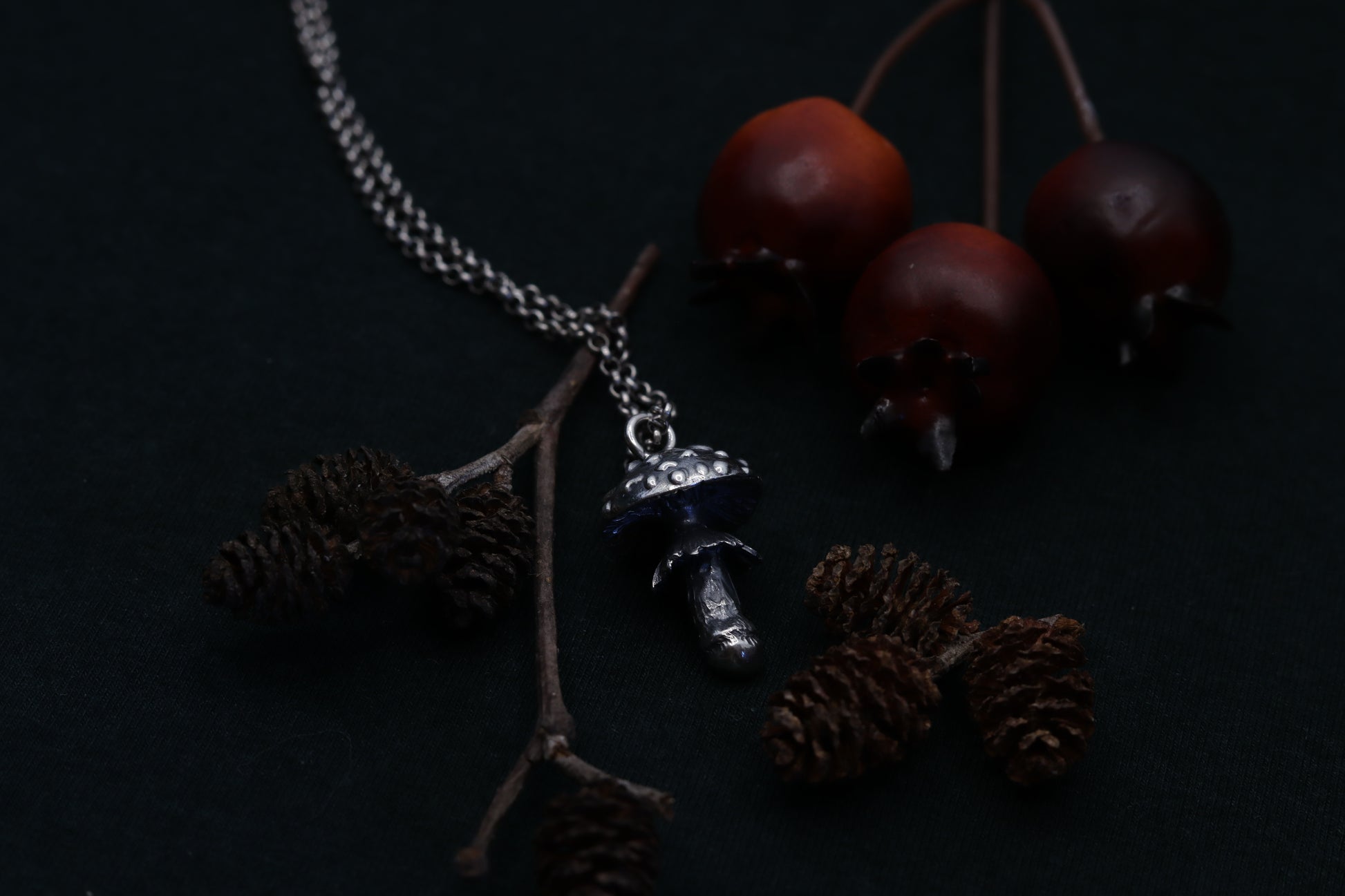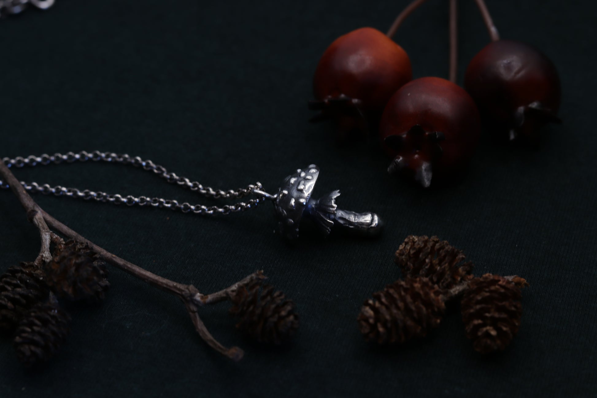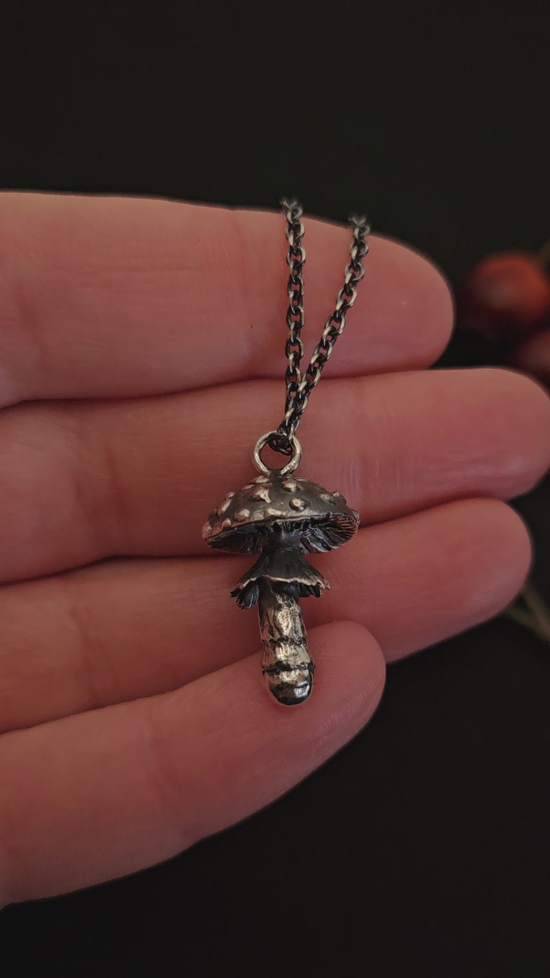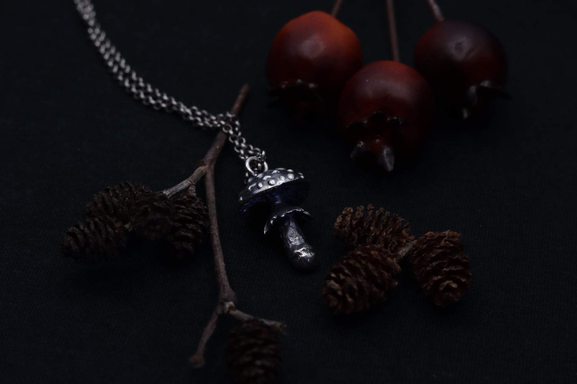 A necklace, featuring a meticulously crafted fly agaric charm. Dangle nature's mystique around your neck, where the detailed mushroom form reveals tales of woodland adventures and hidden grove mysteries. Adorn yourself with this symbol of enchantment, and let every glance towards it transport you to the heart of the forest.