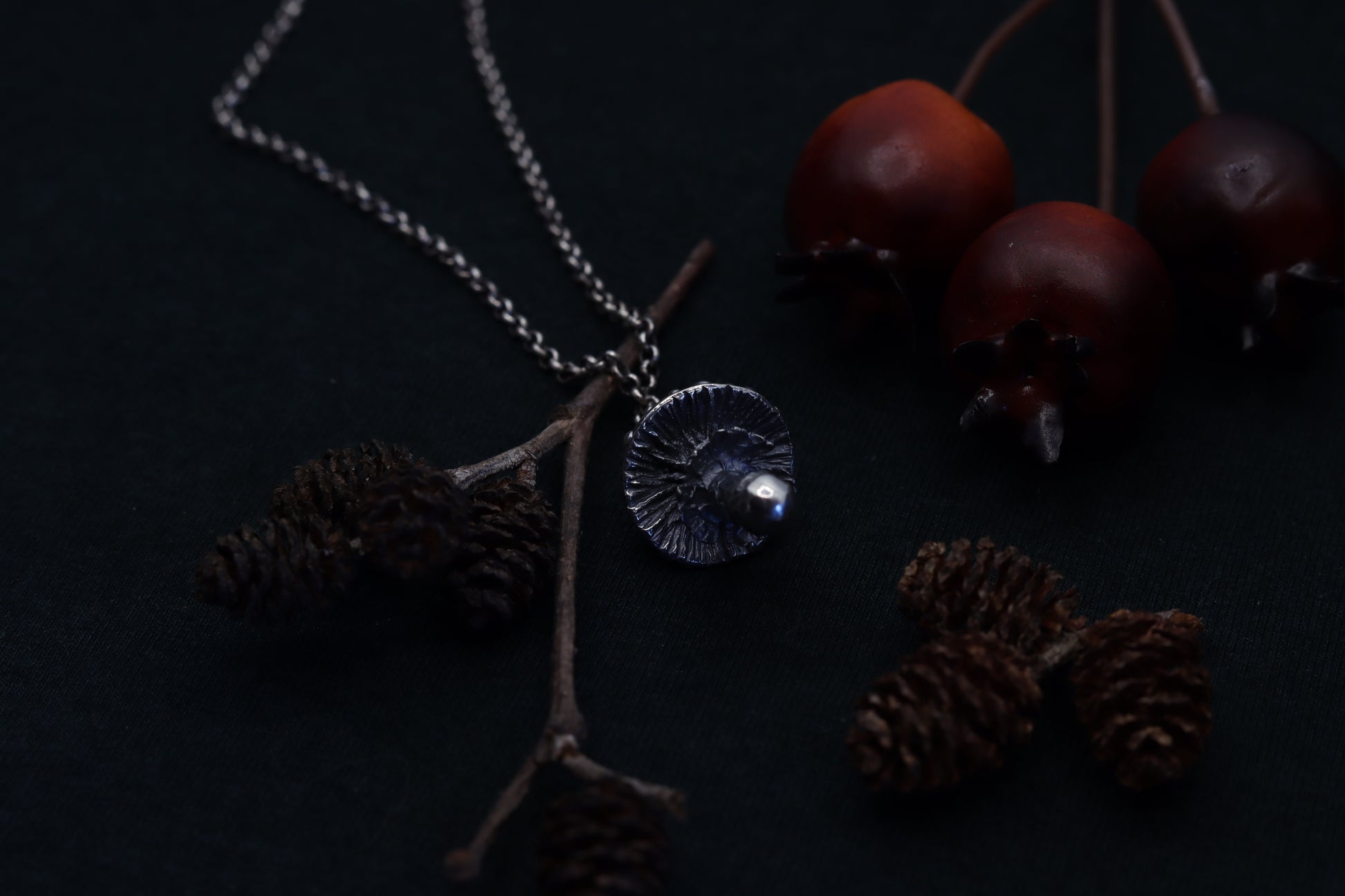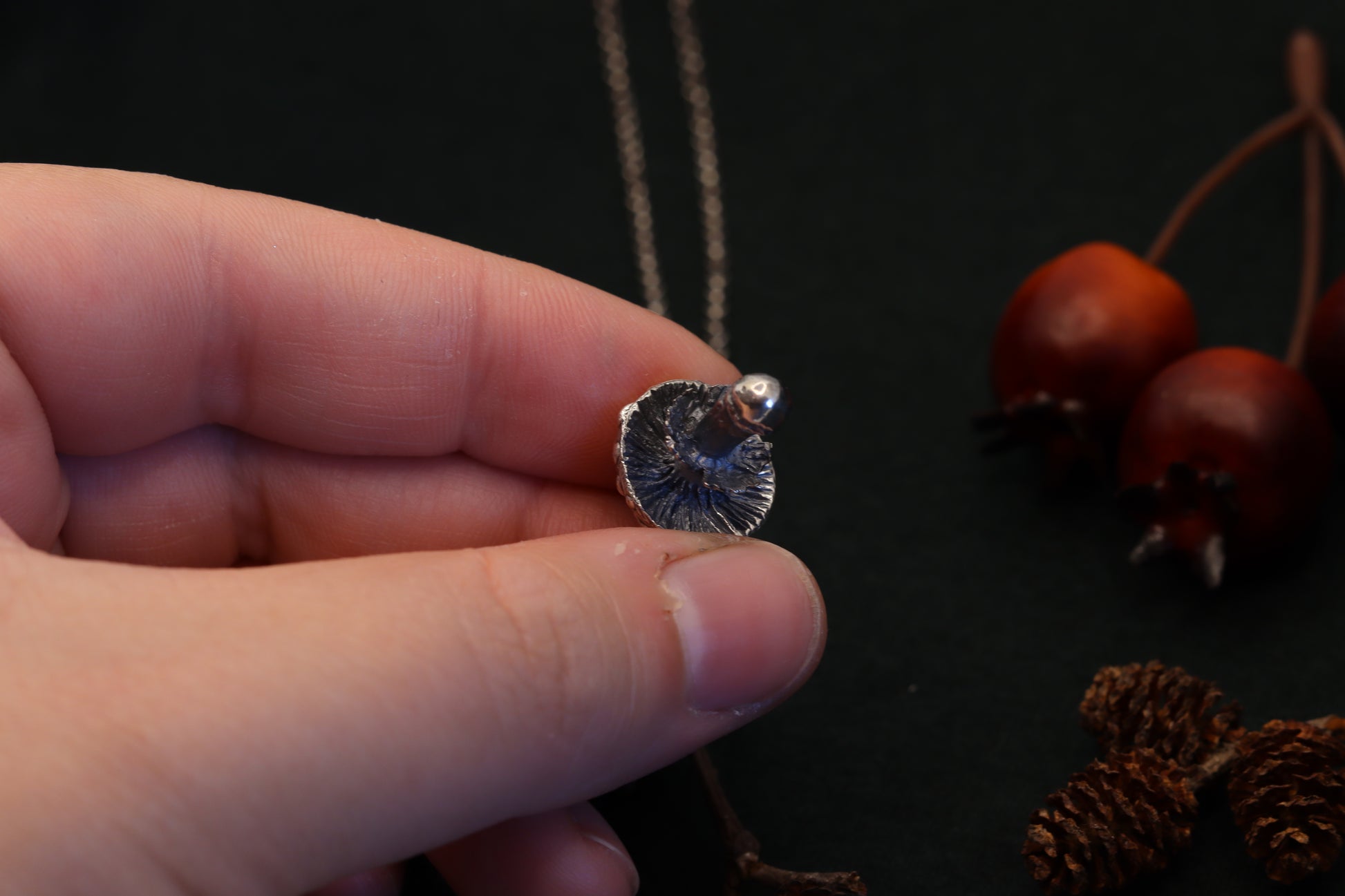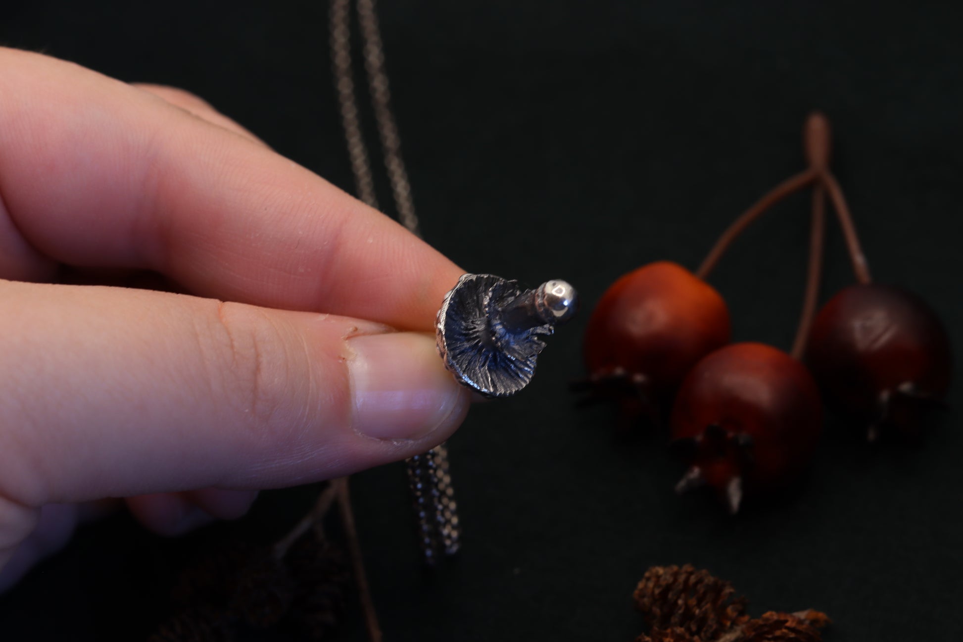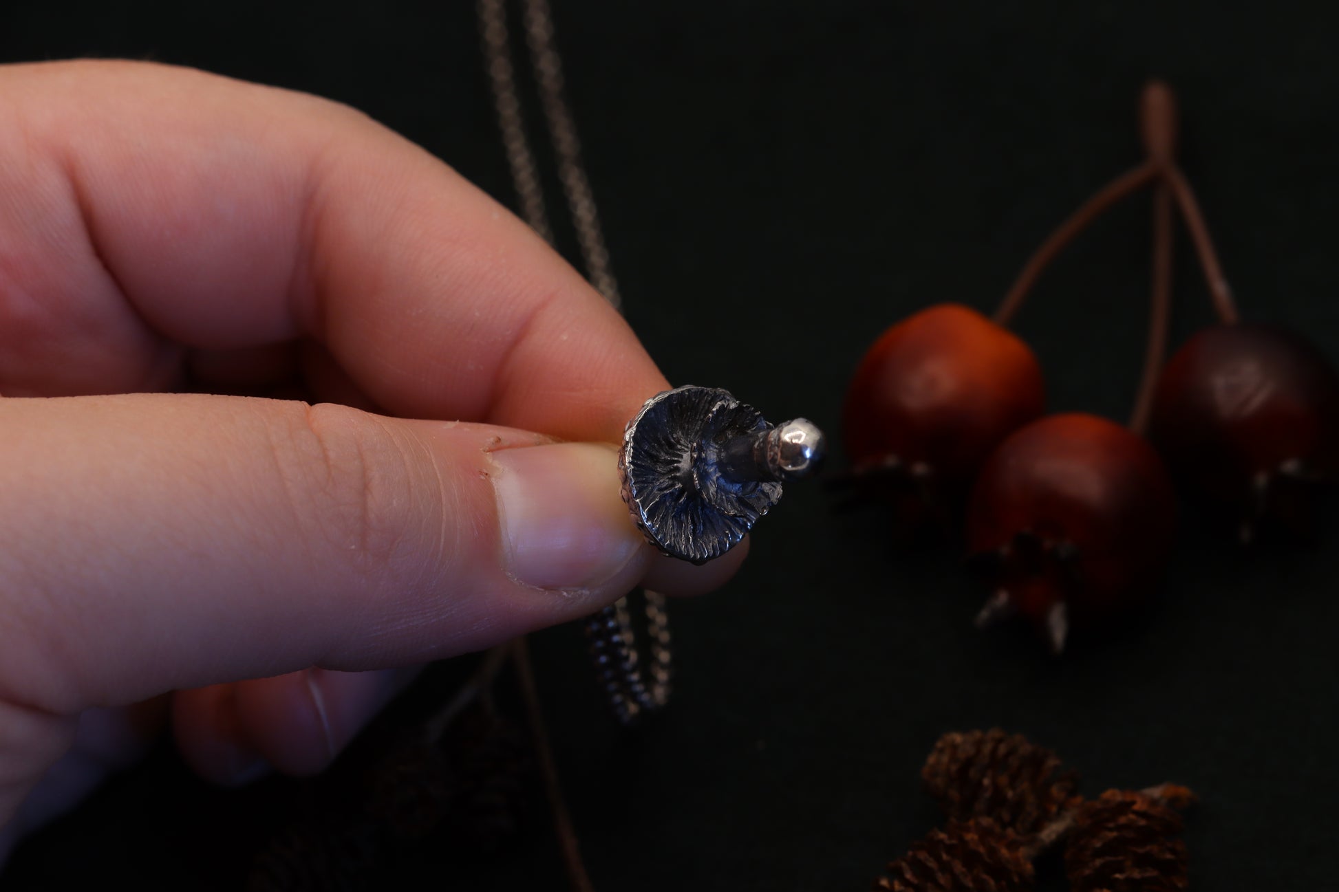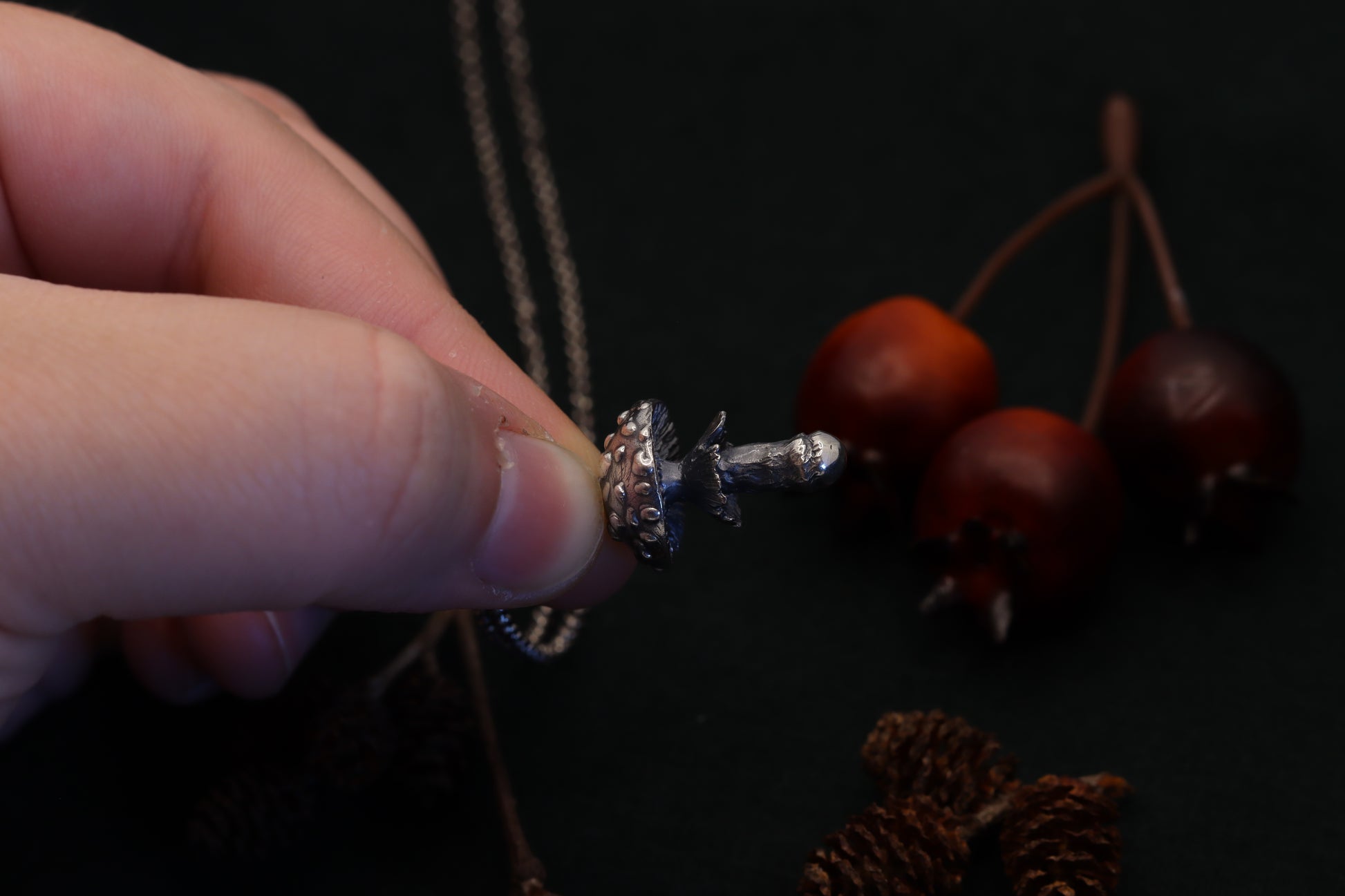 A necklace, featuring a meticulously crafted fly agaric charm. Dangle nature's mystique around your neck, where the detailed mushroom form reveals tales of woodland adventures and hidden grove mysteries. Adorn yourself with this symbol of enchantment, and let every glance towards it transport you to the heart of the forest.
