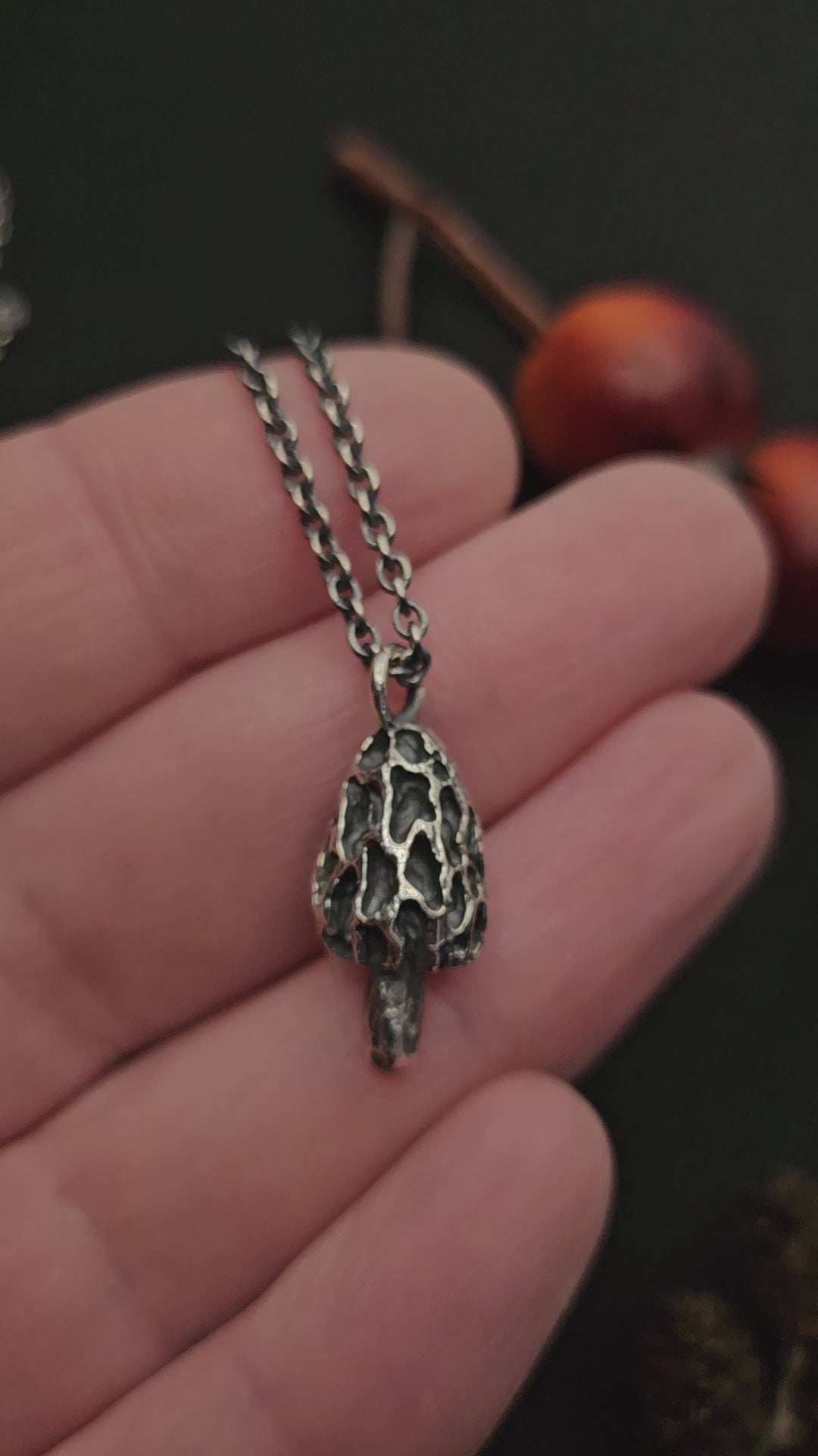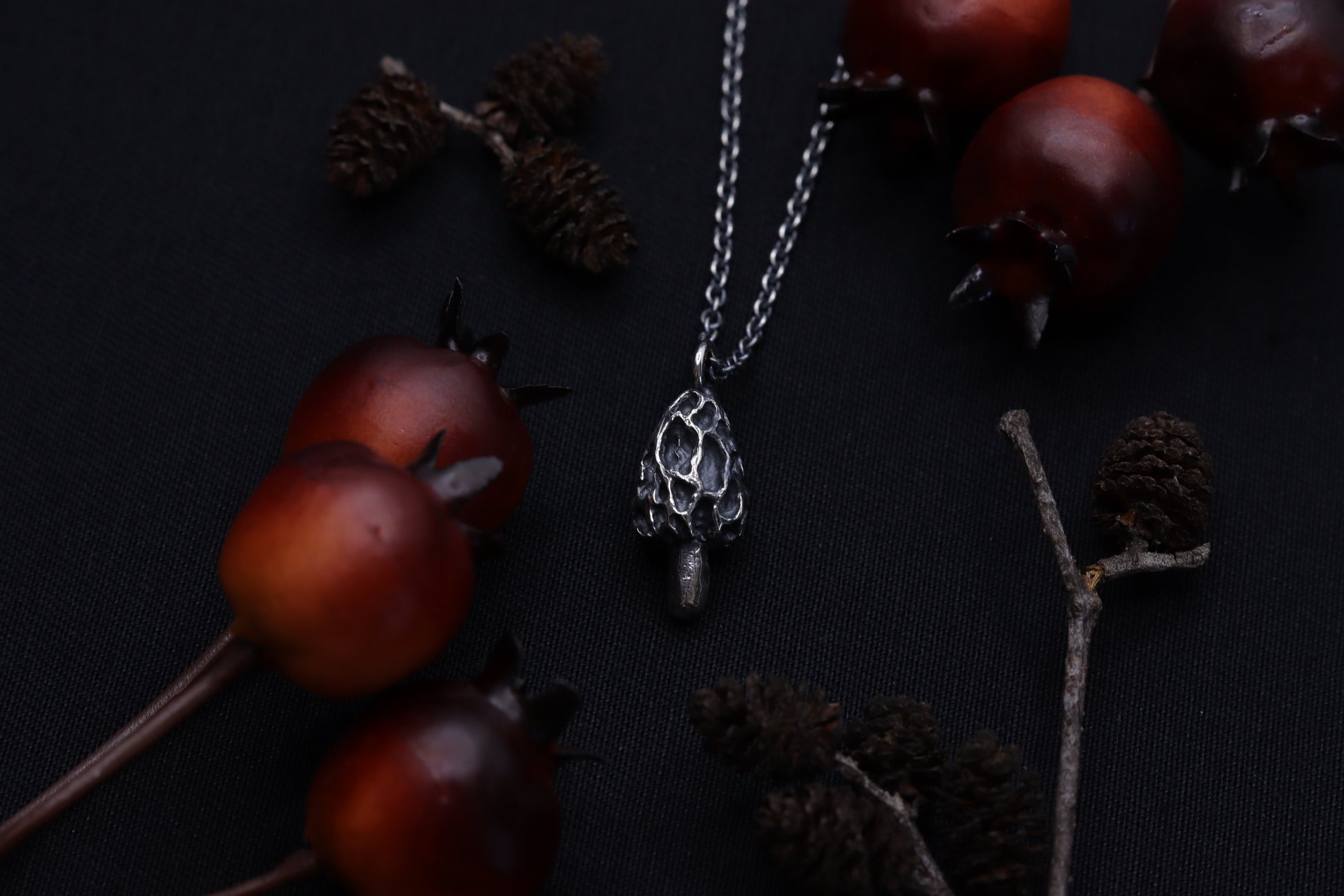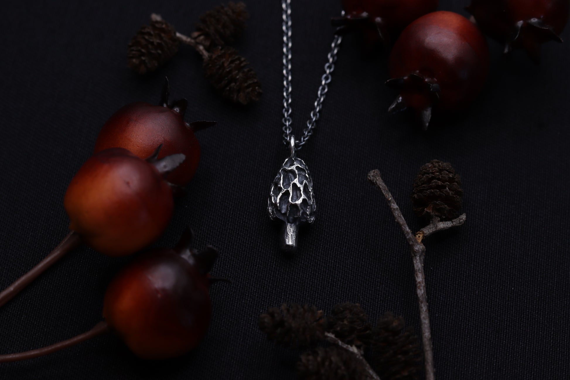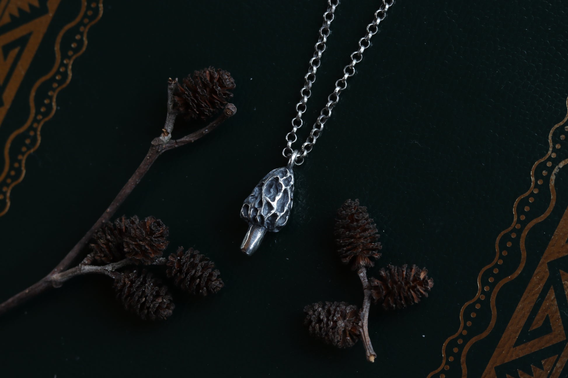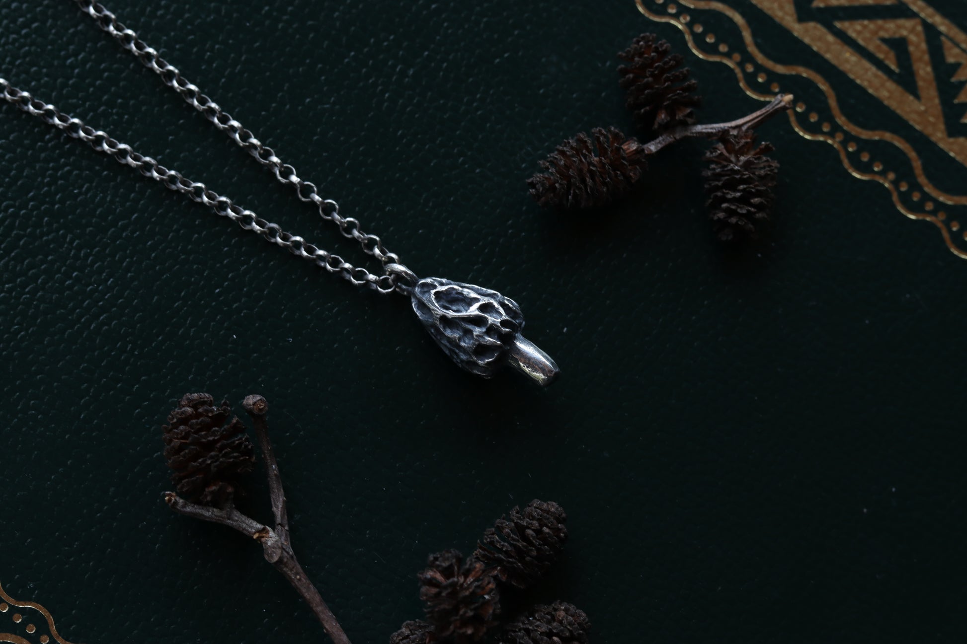 A meticulously crafted silver Morel necklace, celebrating the forest's hidden treasures. Perfect for those with a penchant for woodland wonders or the subtle magic of nature. Drape it on and carry a piece of the woodland realm with you, wherever you roam.
