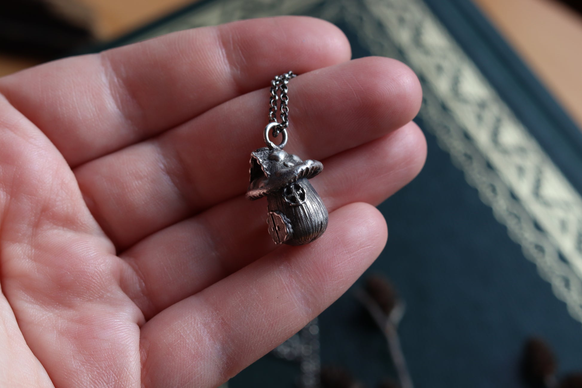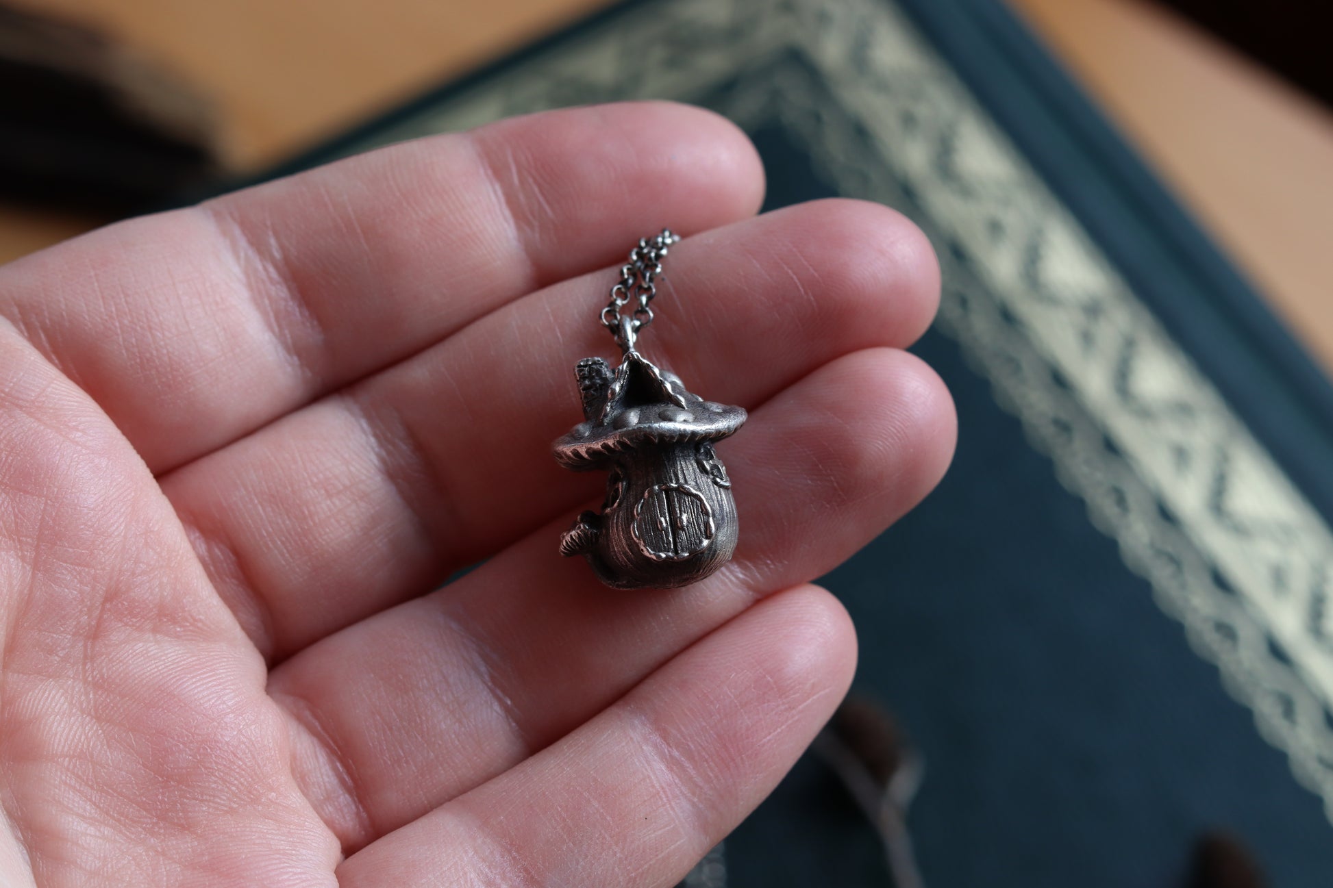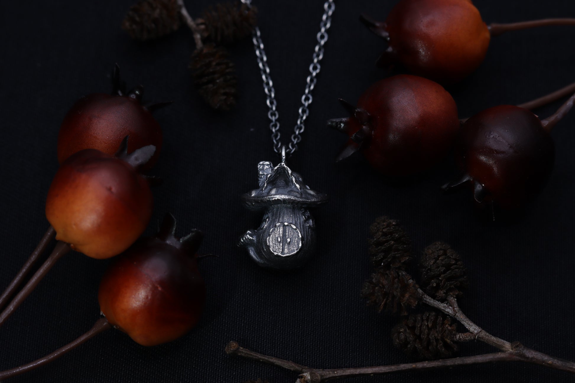 A necklace, showcasing an exquisite silver mushroom house charm. Enveloped in the allure of forest dwellings and fairytales, its intricate details summon images of hidden doorways and magical inhabitants. Wear this piece as a token of enchanting escapes, guiding you to lands where fantasy and reality entwine.