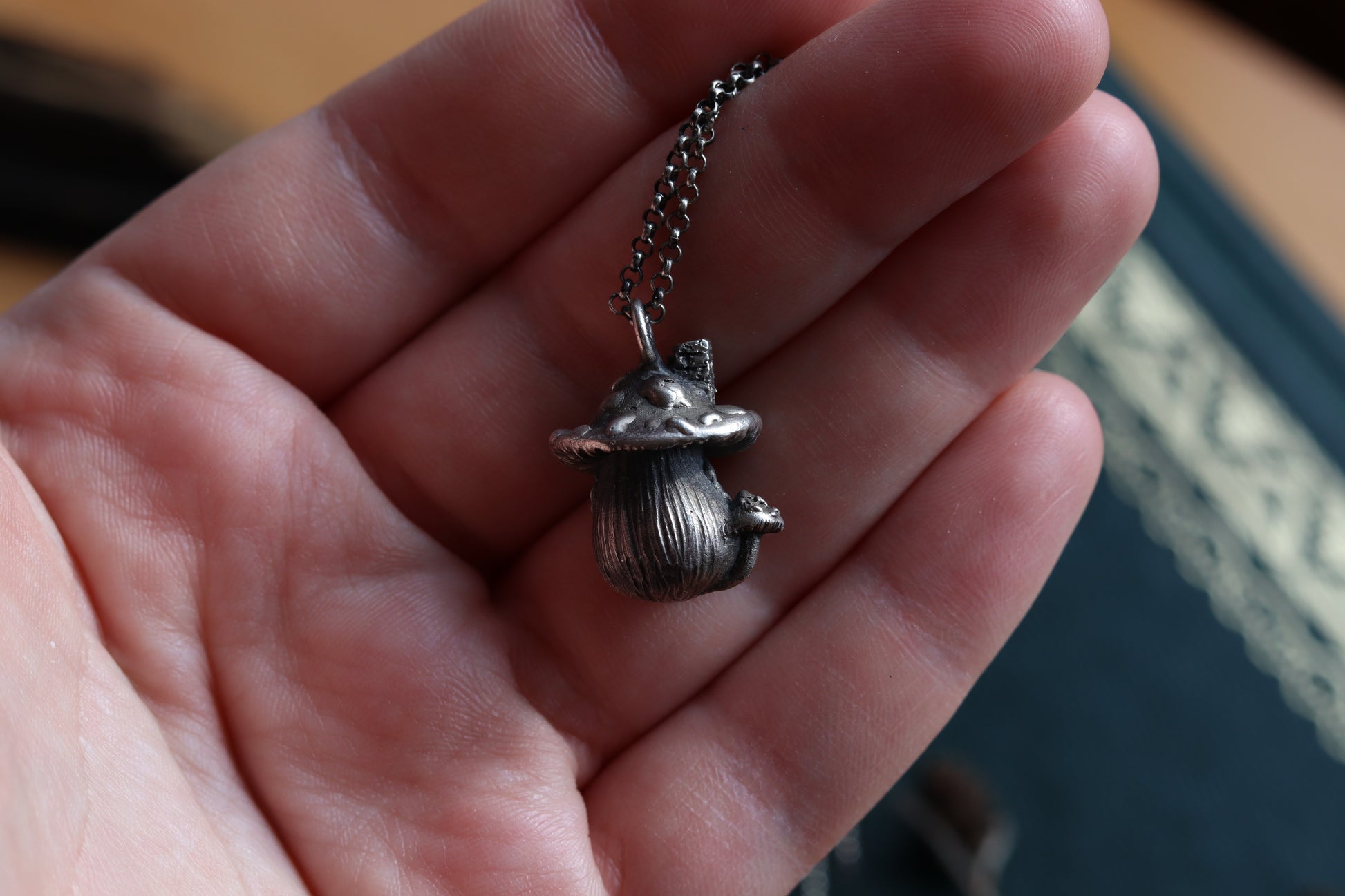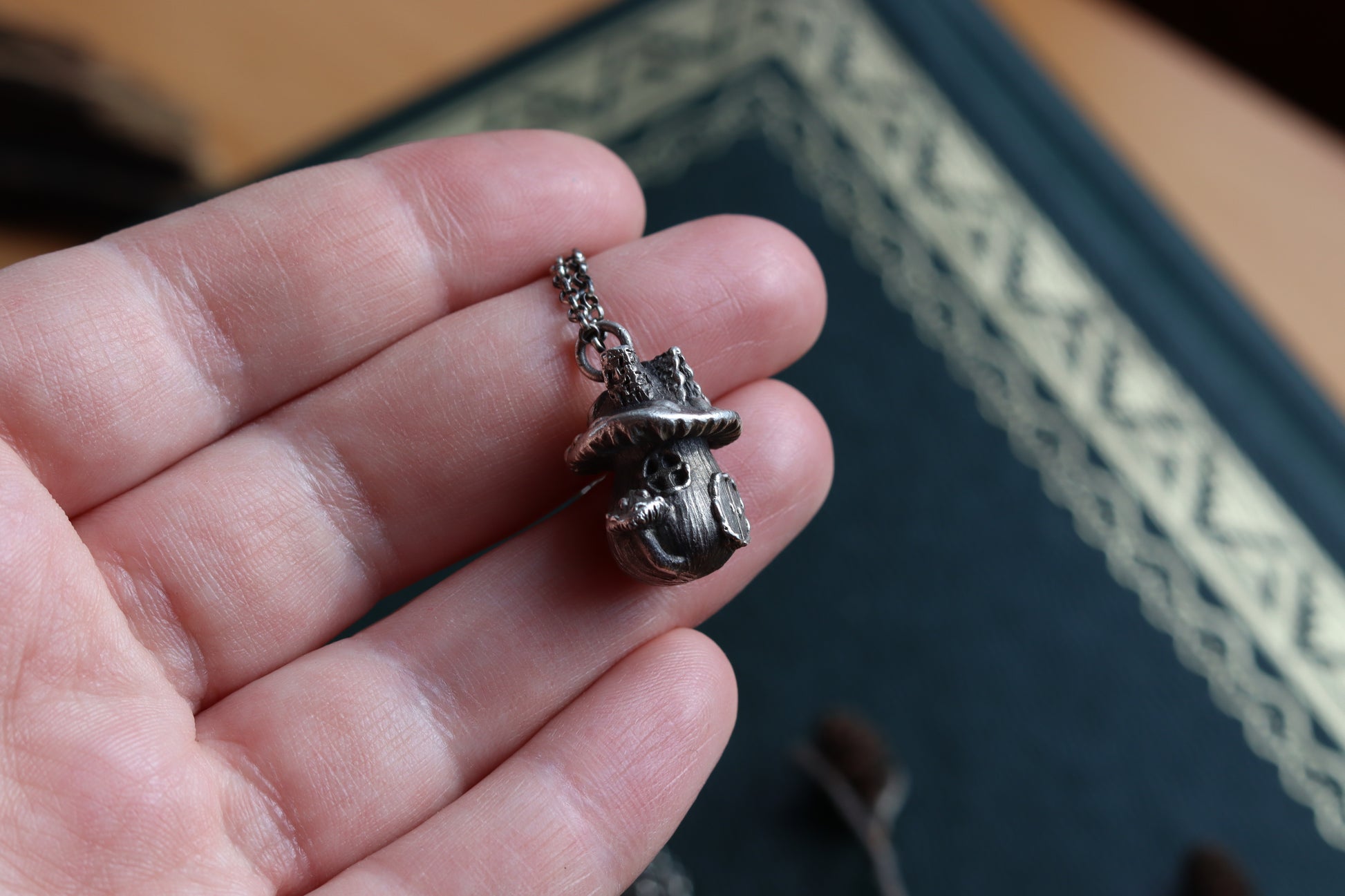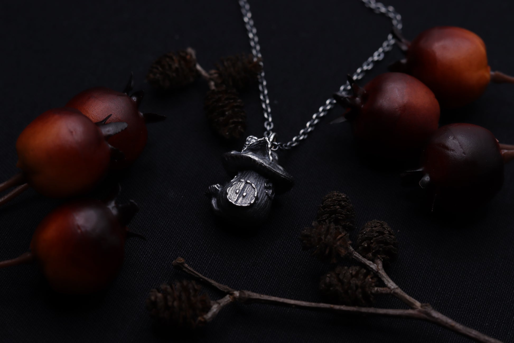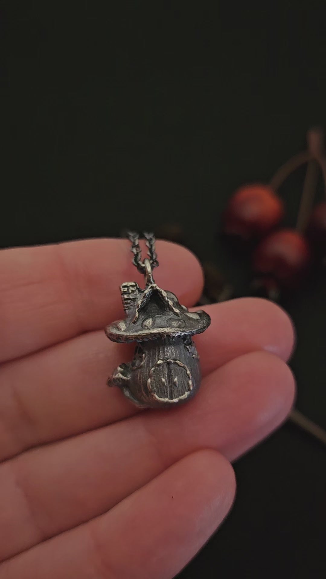 A necklace, showcasing an exquisite silver mushroom house charm. Enveloped in the allure of forest dwellings and fairytales, its intricate details summon images of hidden doorways and magical inhabitants. Wear this piece as a token of enchanting escapes, guiding you to lands where fantasy and reality entwine.