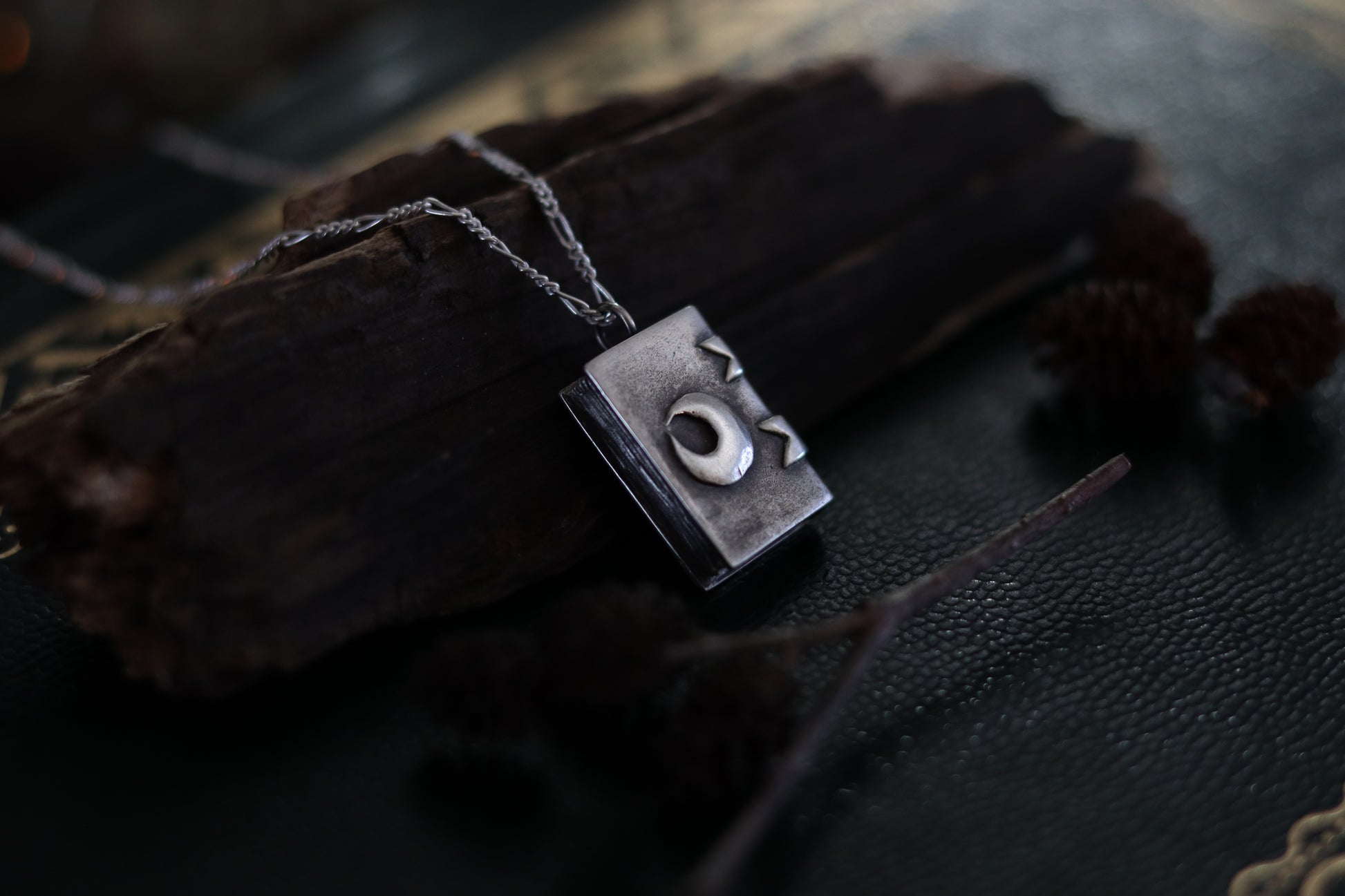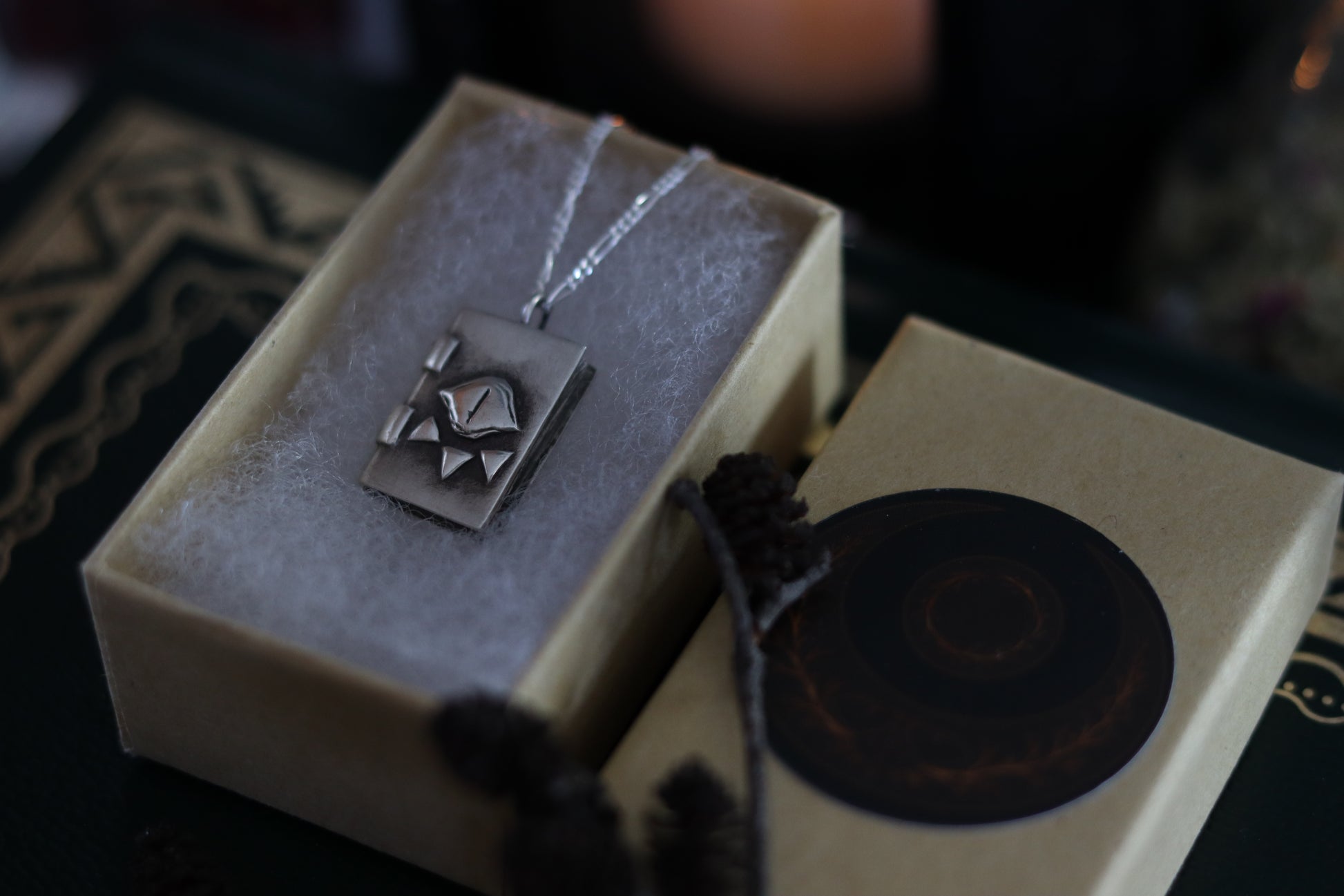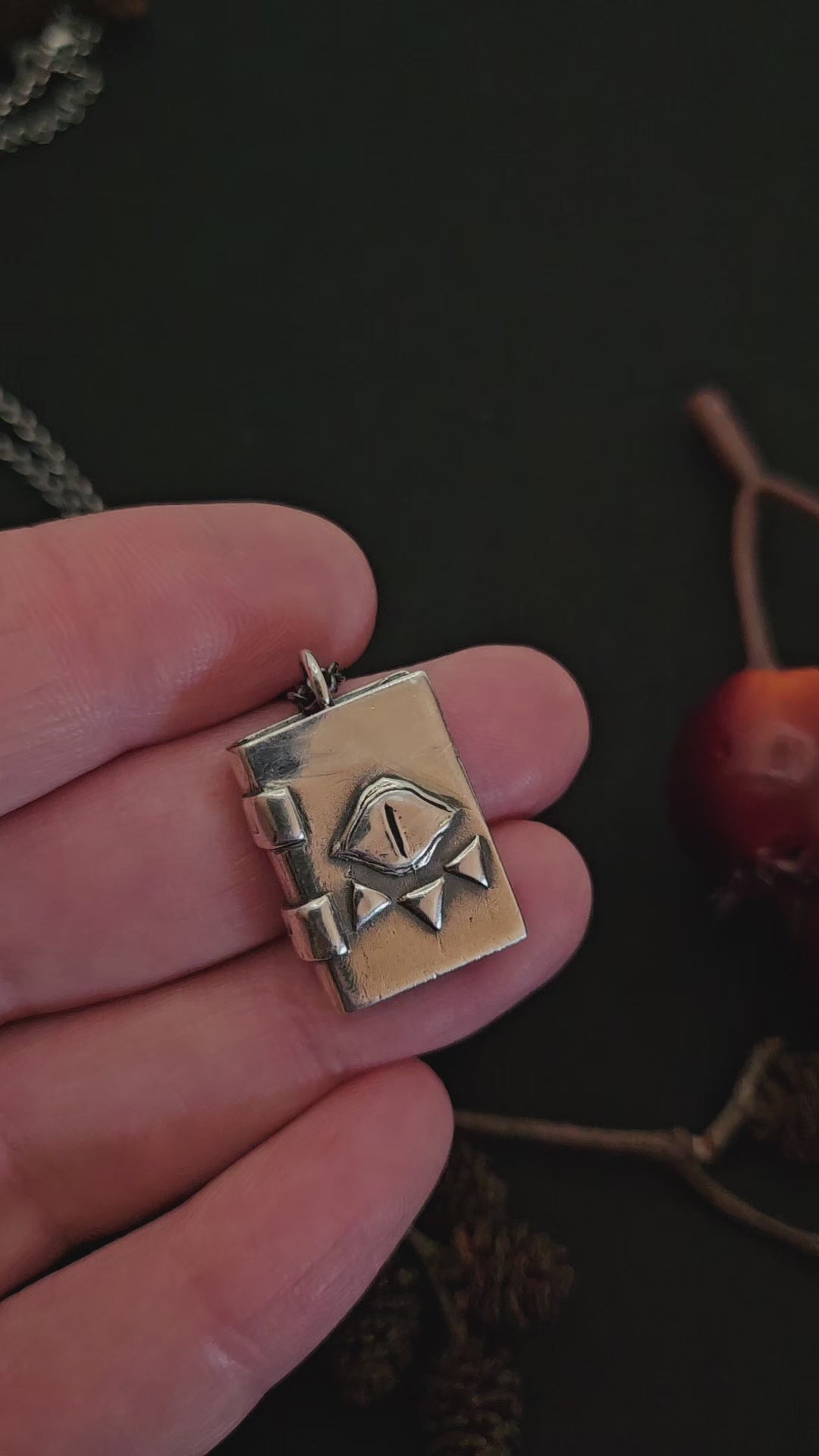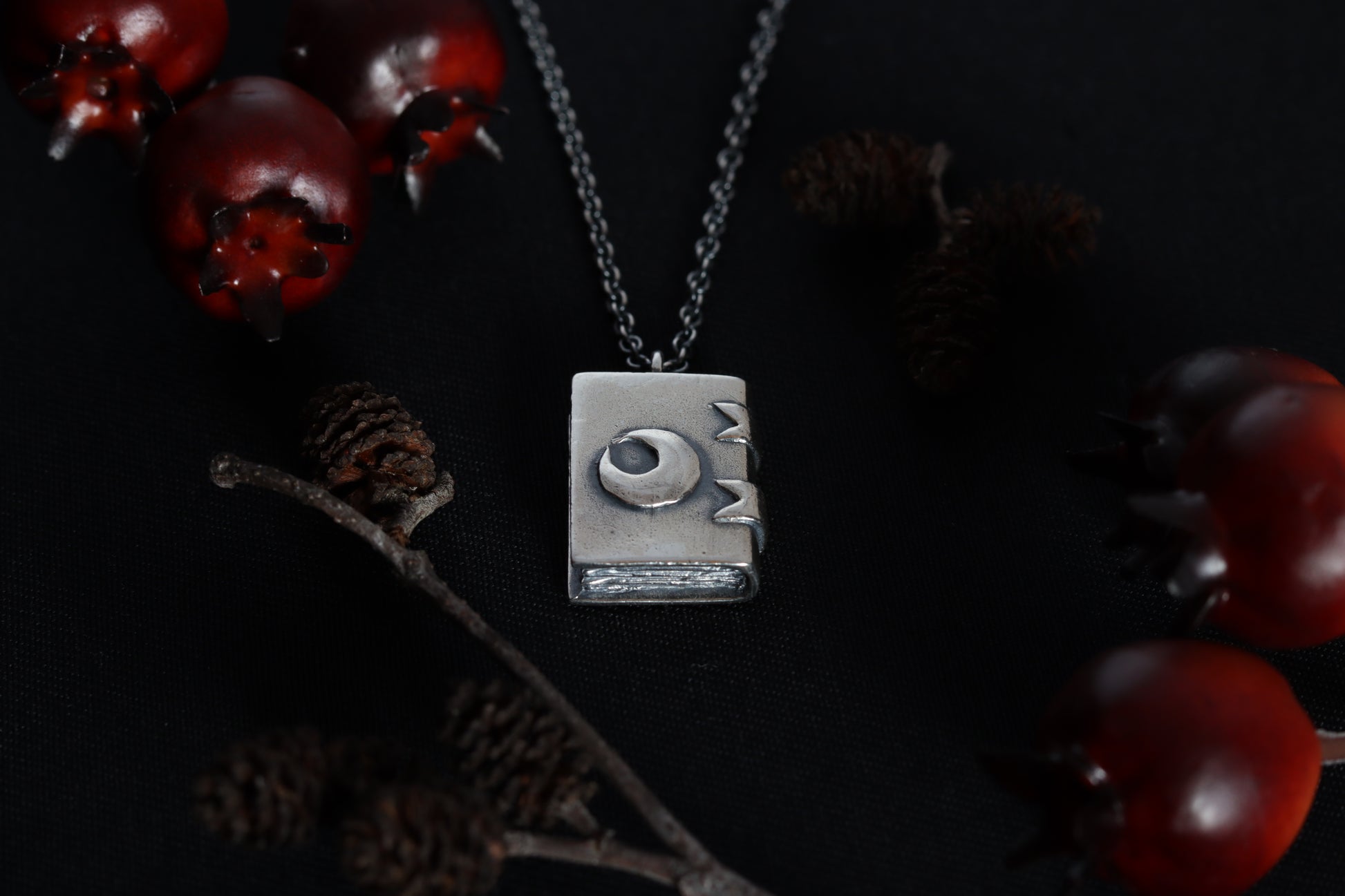 An arcane silver necklace for seekers of the forbidden. Clasped within this pendant is the essence of the Necronomicon, the legendary tome of dark arts. A whispered accessory for those drawn to the mysteries beyond our realm.