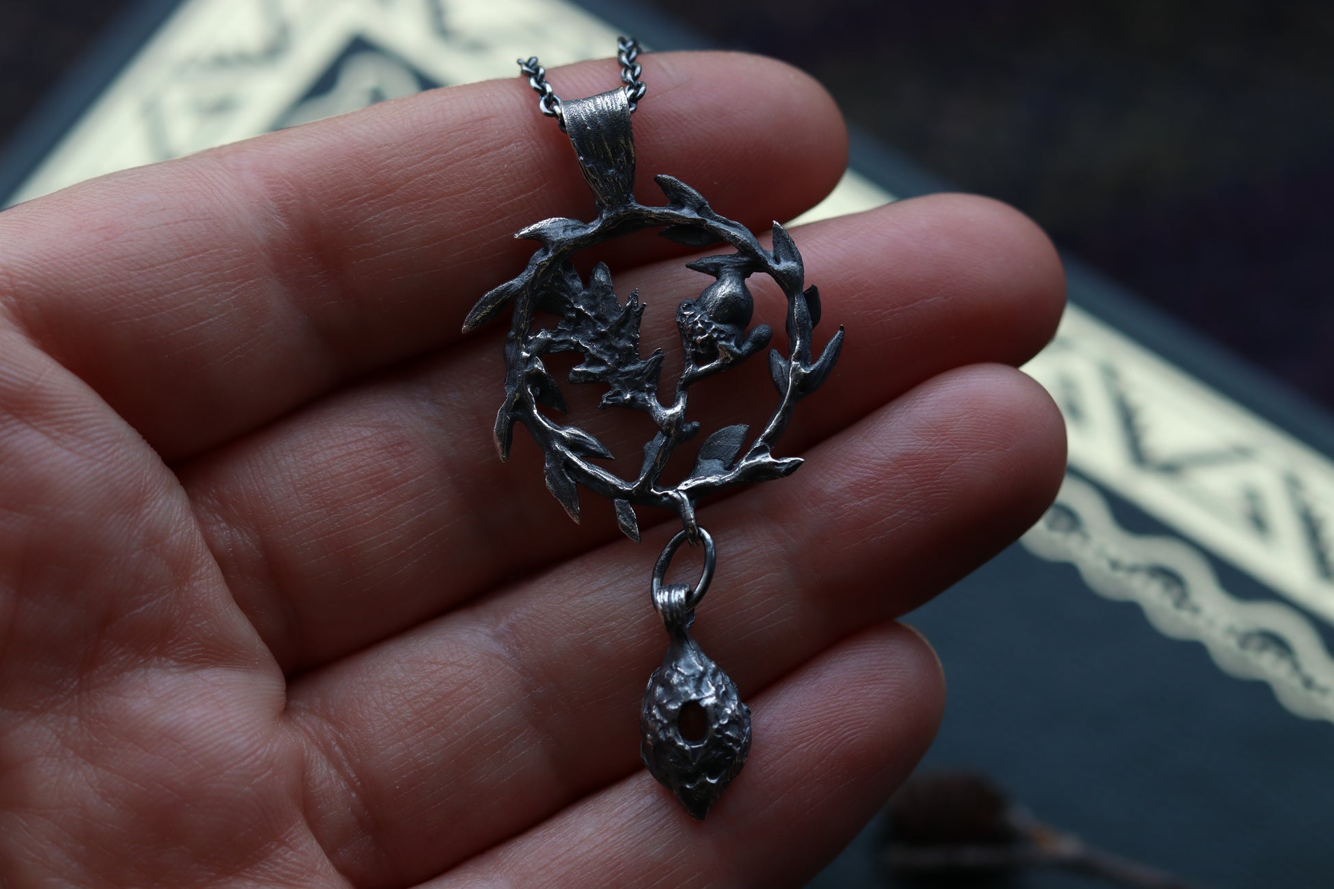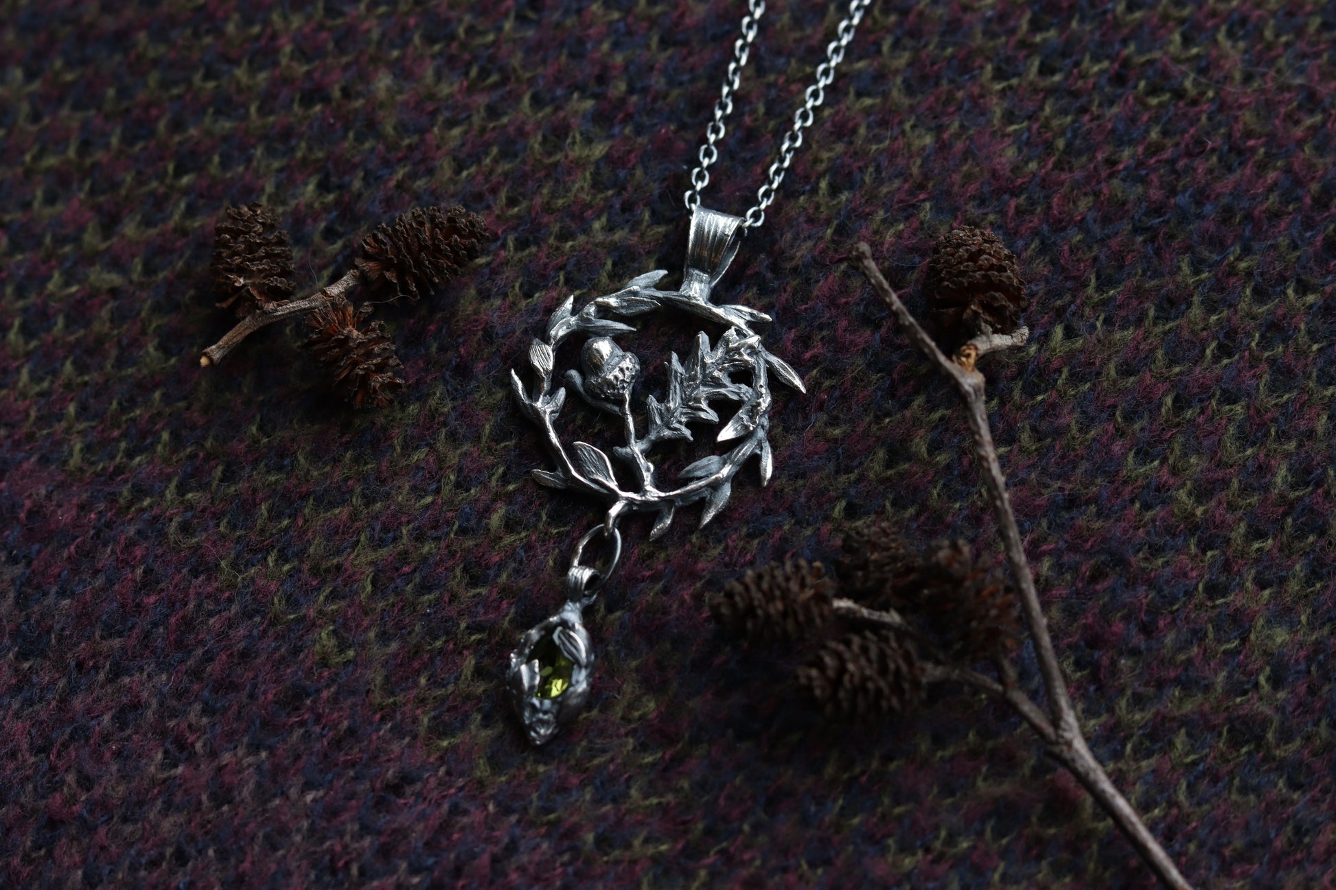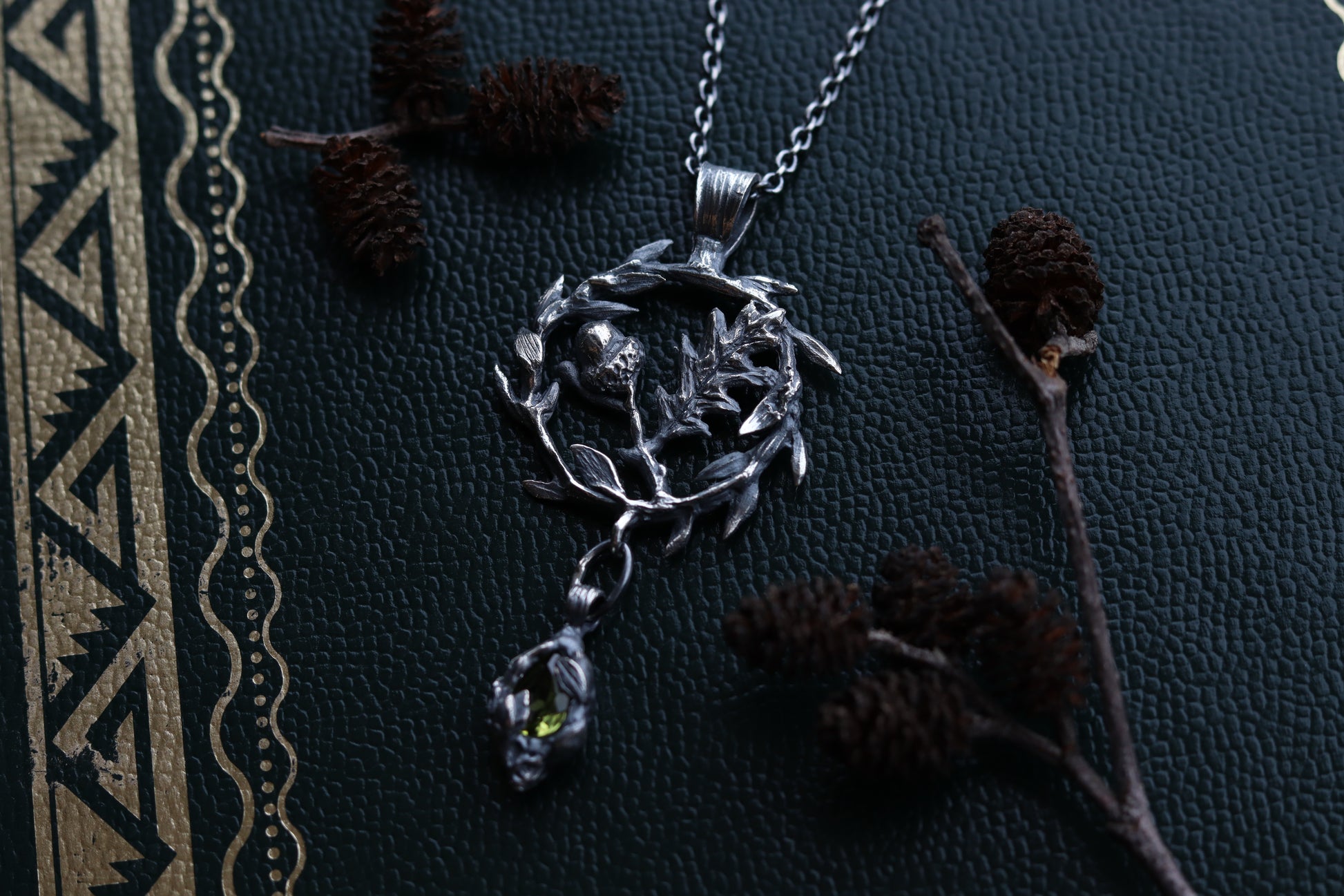 This sterling silver talisman features a vibrant peridot stone at its heart, set within a detailed sculpted seed. The tree's branches and leaves are intricately crafted, with a lifelike texture and a tiny acorn. The peridot glows with a lively green, symbolizing vitality and growth. This necklace embodies the strength, resilience, and natural beauty of the oak tree. This is inspired by Halsin from Baldur's Gate.