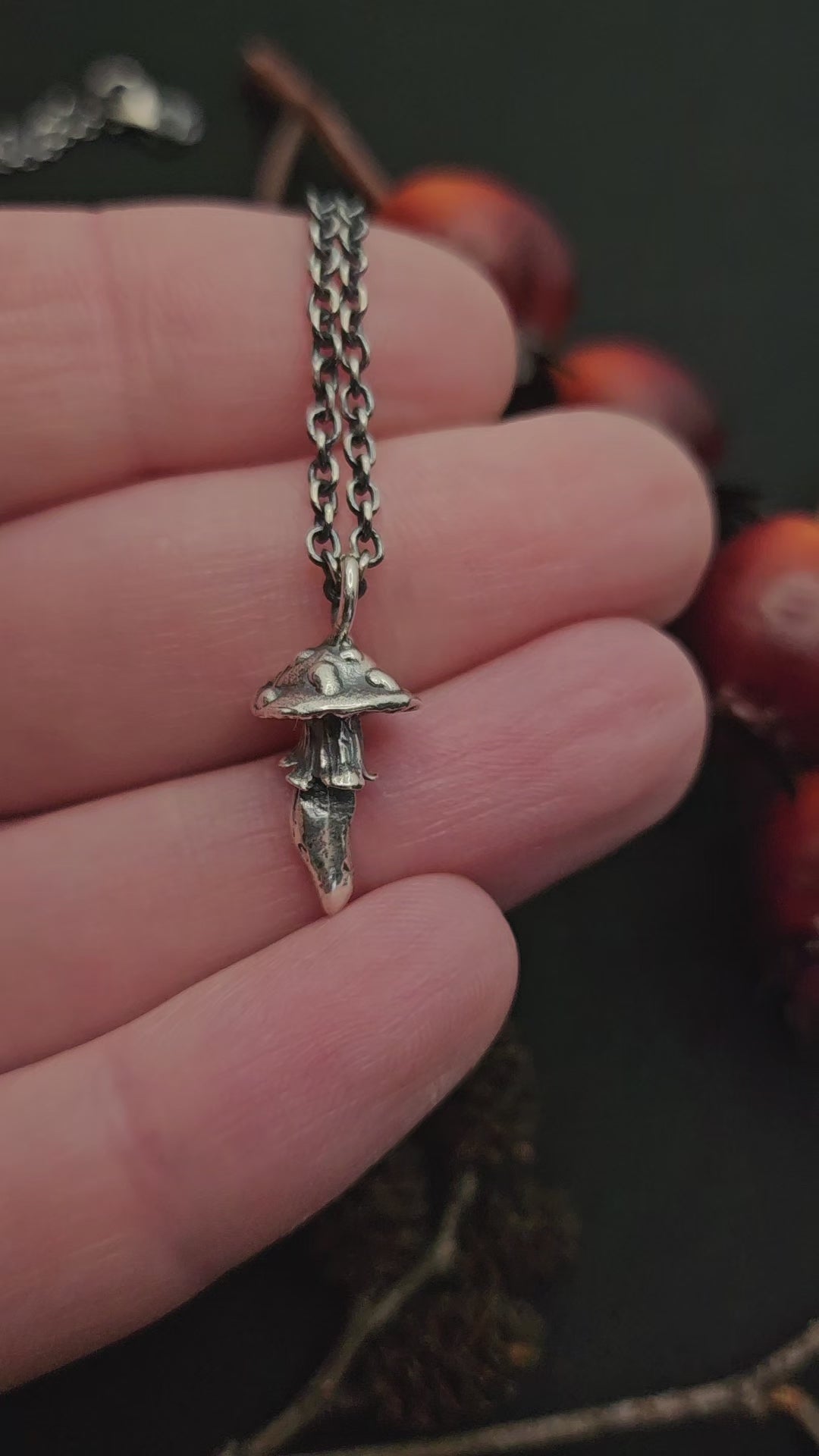 A necklace, featuring a meticulously crafted fly agaric charm. Dangle nature's mystique around your neck, where the detailed mushroom form reveals tales of woodland adventures and hidden grove mysteries. Adorn yourself with this symbol of enchantment, and let every glance towards it transport you to the heart of the forest.