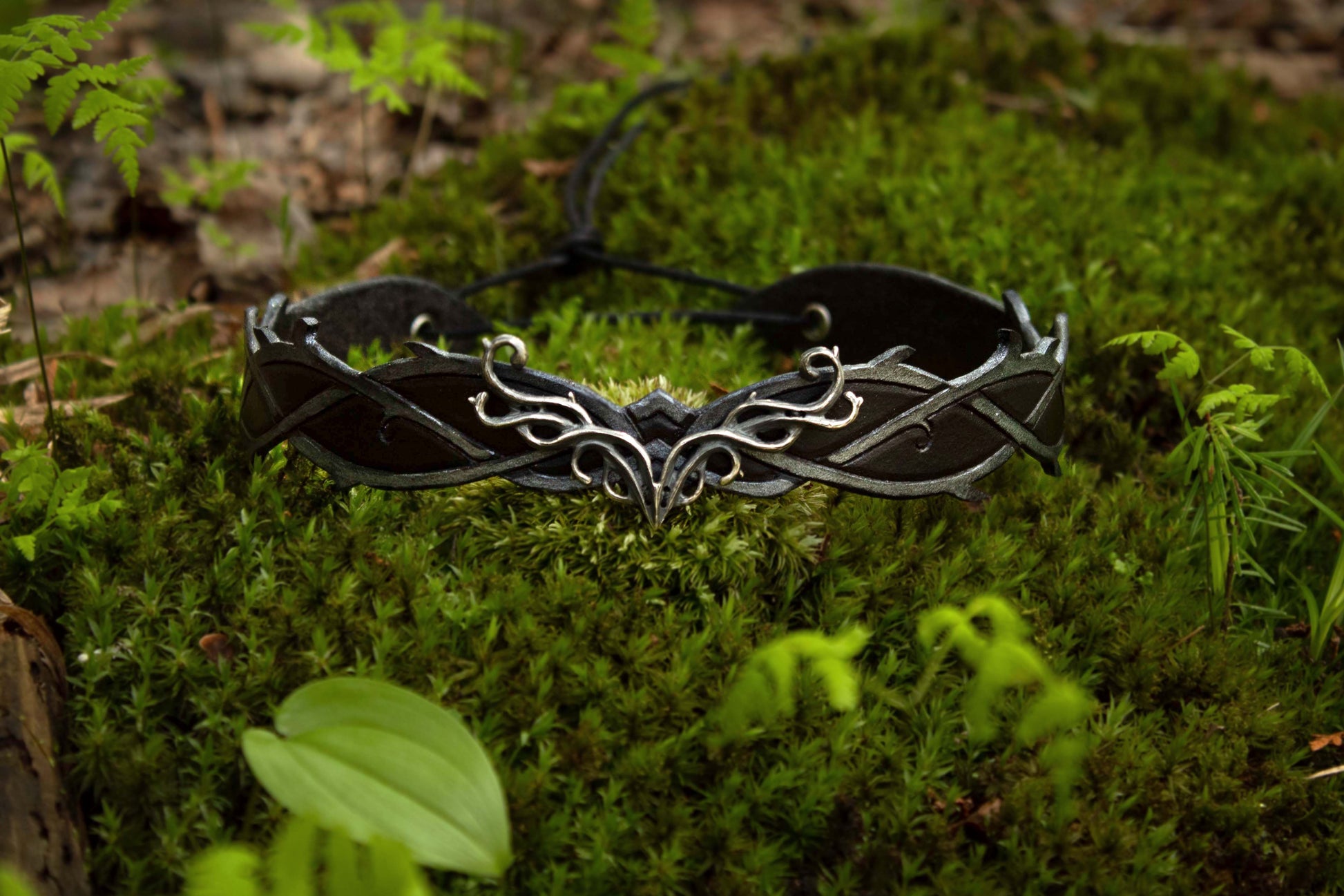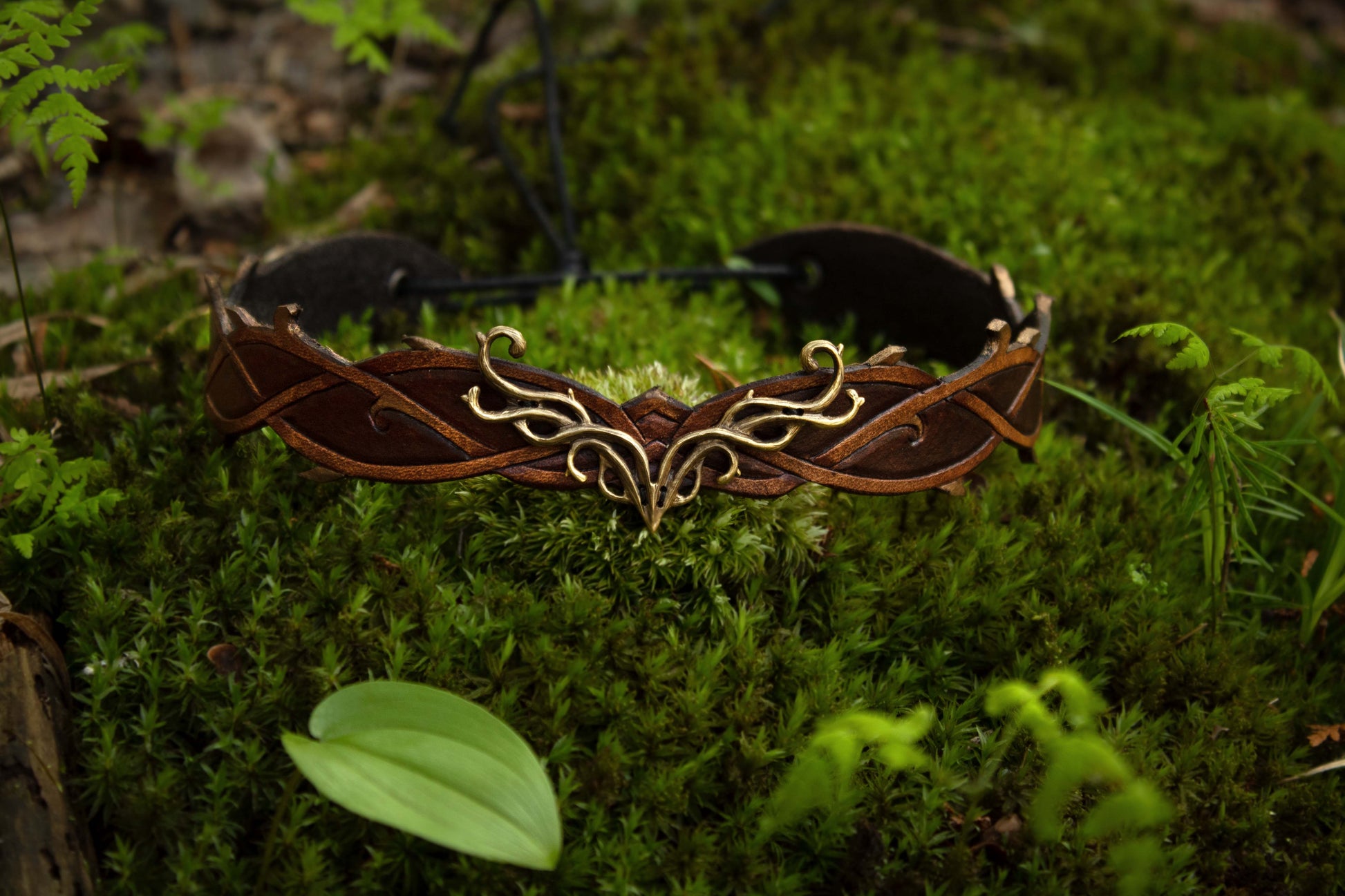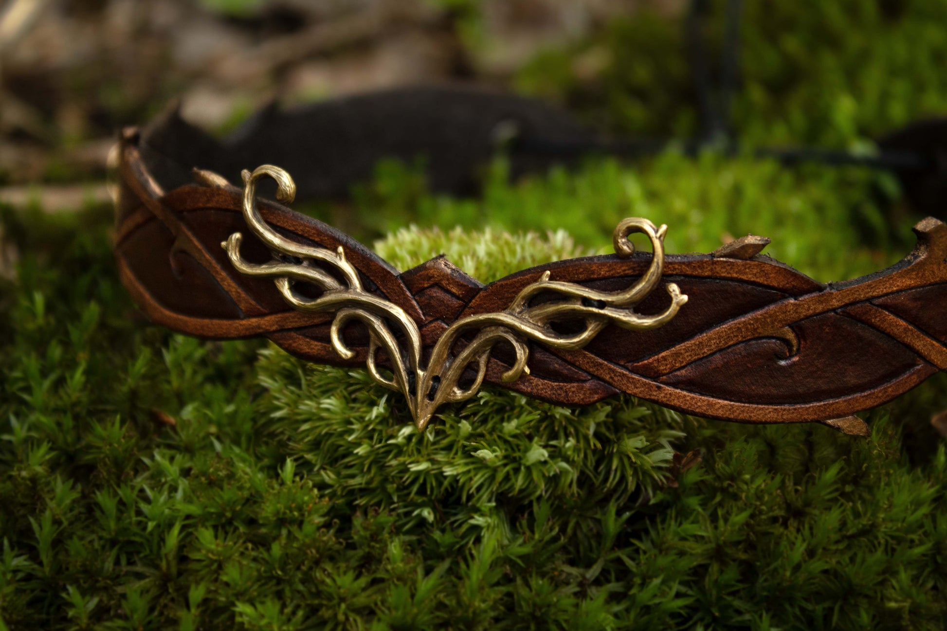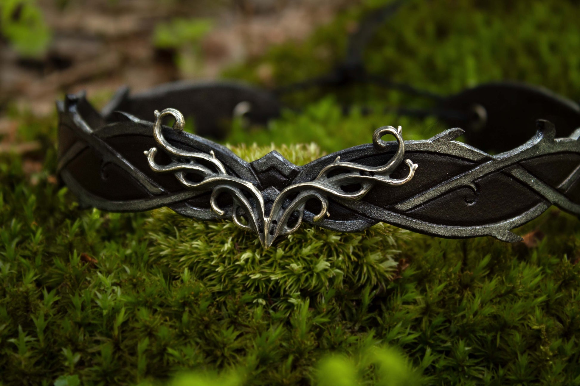 A rich brown wood and a deep black and smoky grey leather tiara with a brass or a silver centerpiece representing antlers and wood. Made with quality leather and solid metal, the Elven Woodland Tiara beautifully blends the art of leathercraft and jewelry. Each piece is brought to life using traditional tools and techniques. The Elven Woodland Tiara are made in small batches as ordered, by us!