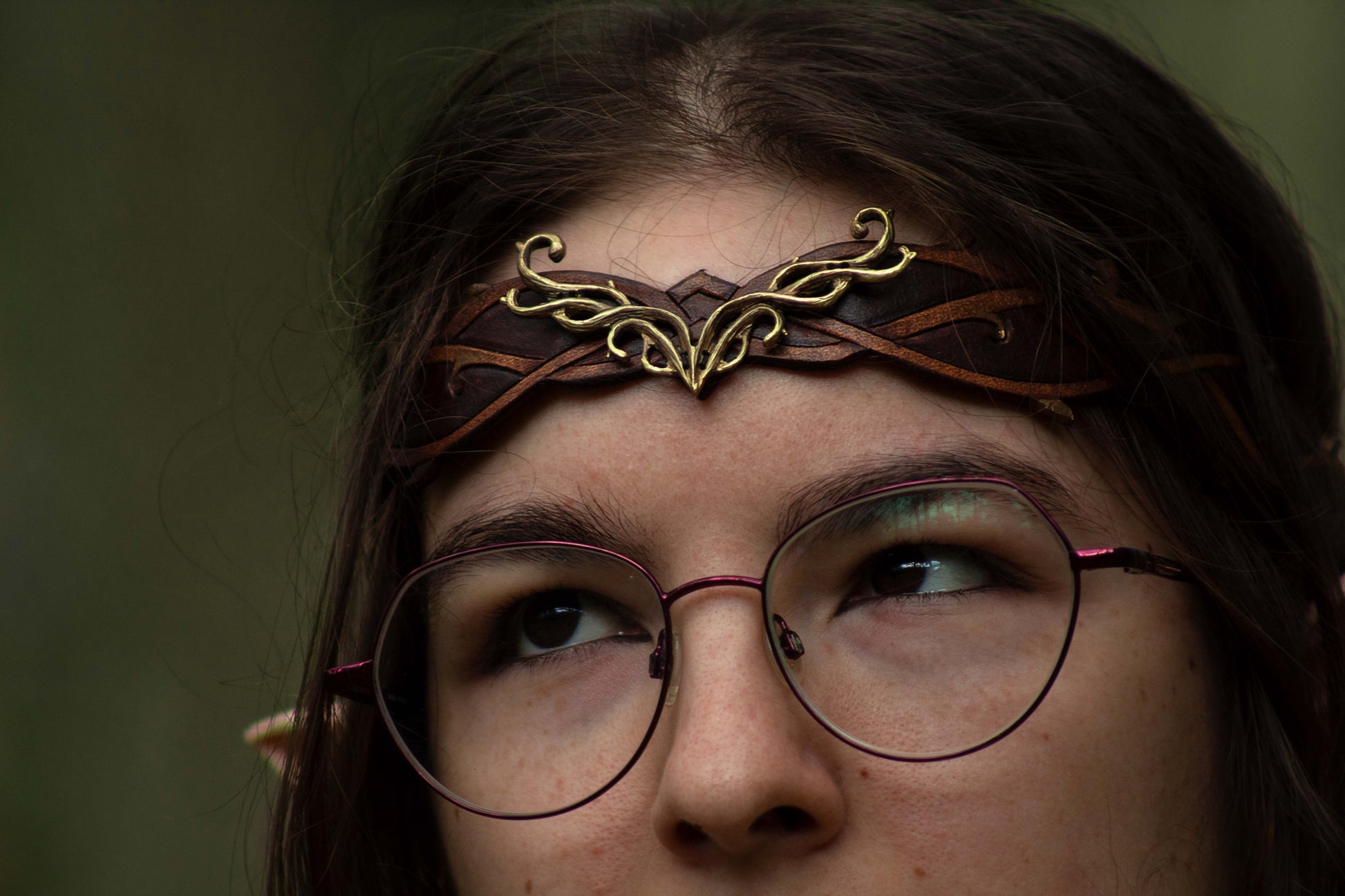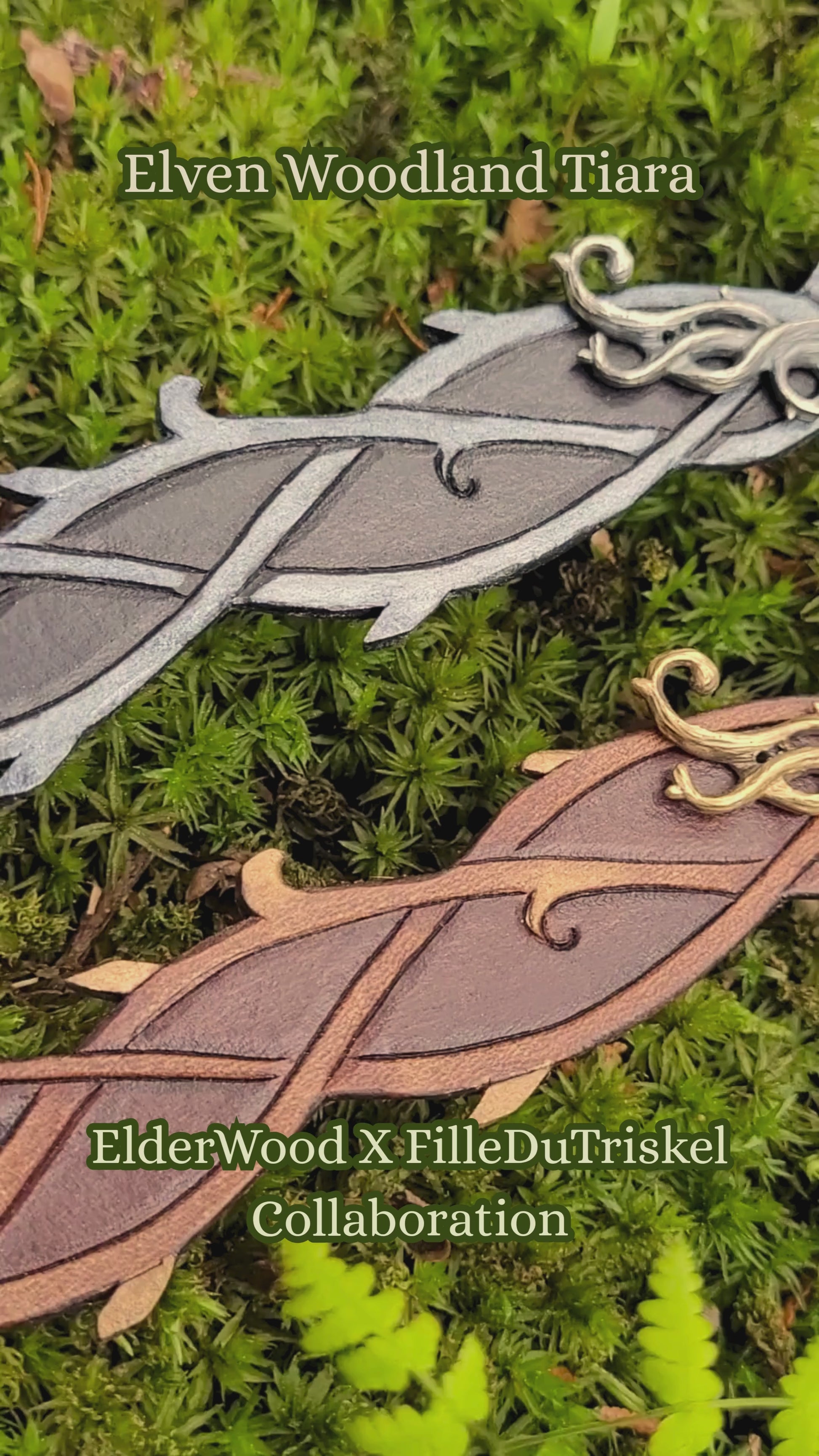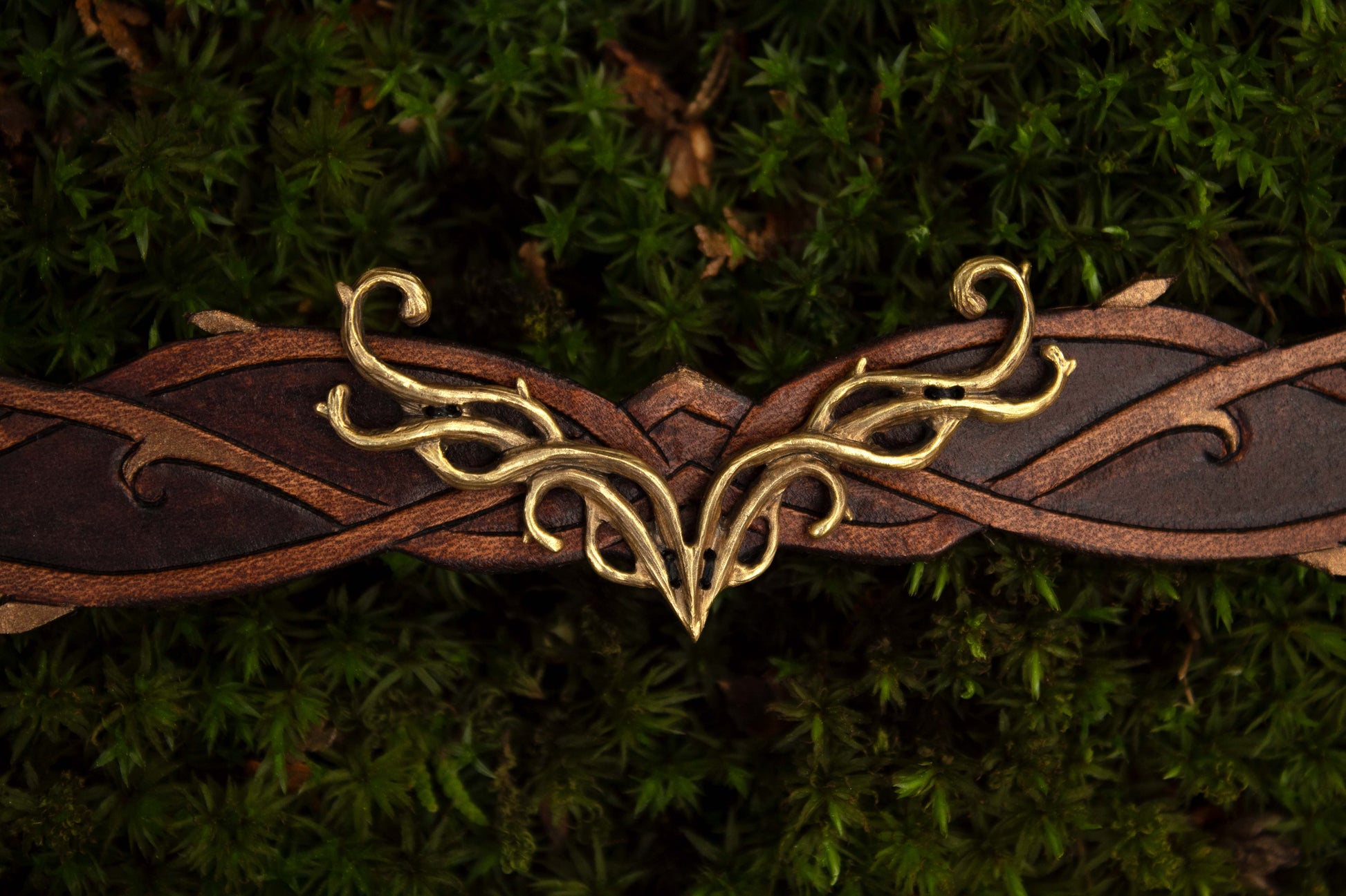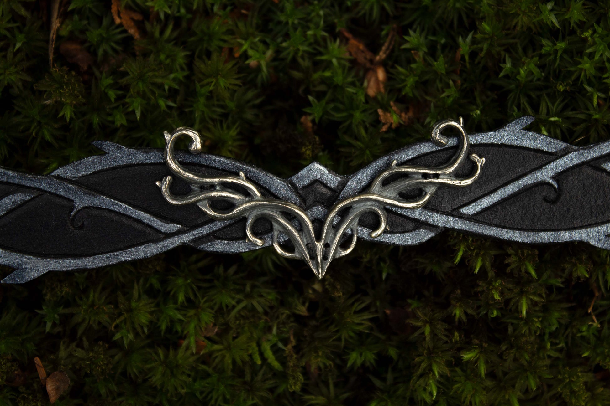 A rich brown wood and a deep black and smoky grey leather tiara with a brass or a silver centerpiece representing antlers and wood. Made with quality leather and solid metal, the Elven Woodland Tiara beautifully blends the art of leathercraft and jewelry. Each piece is brought to life using traditional tools and techniques. The Elven Woodland Tiara are made in small batches as ordered, by us!