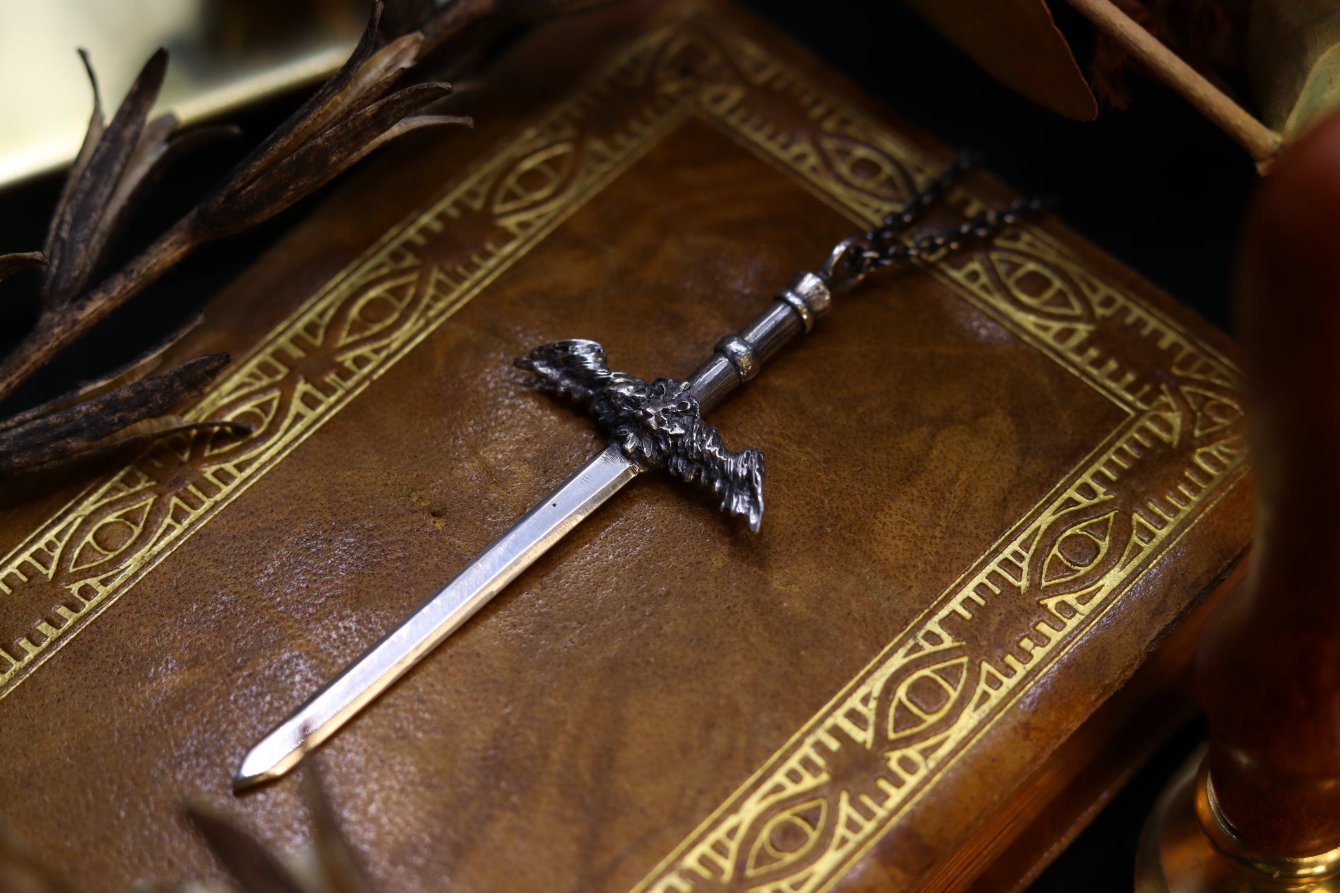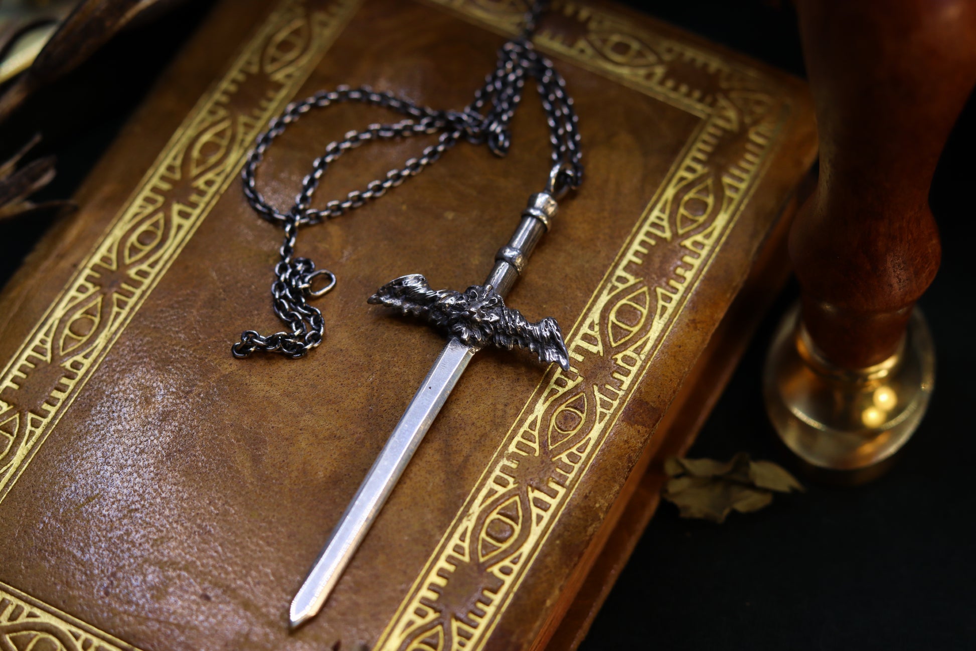 Meticulously hand-sculpted in wax and then cast in Sterling Silver, this winged blade sword is an essential companion when exploring... or cooking with your party in the dungeon.